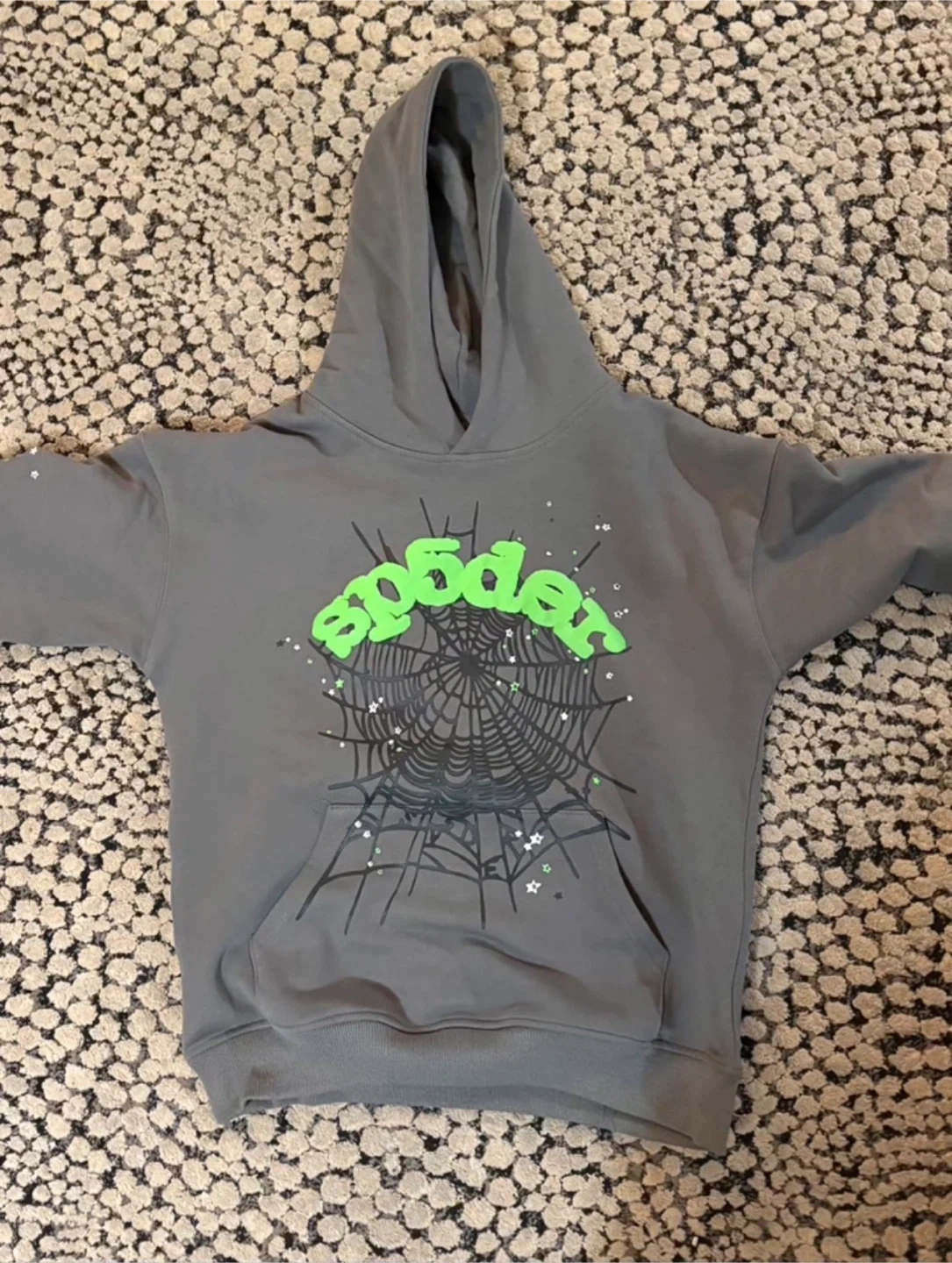 Selling a grey Sp5der hoodie. It's made of 100% cotton and is in great condition. It features a cool spiderweb design on the front. Machine wash cold and tumble dry low