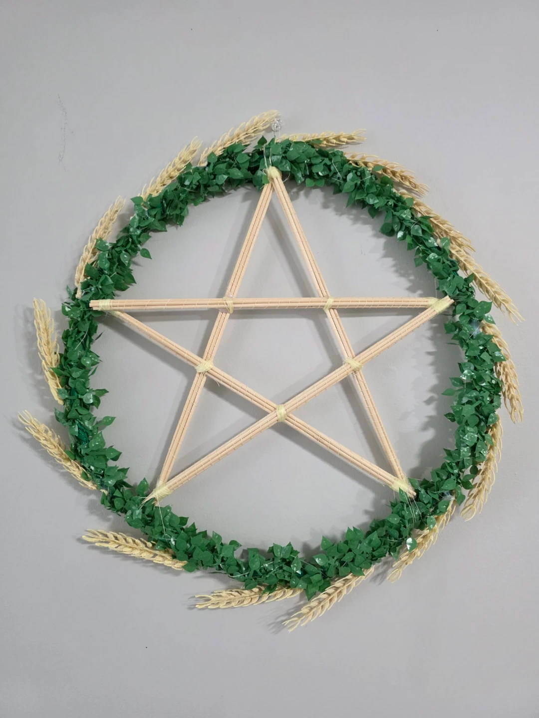 Decorative pentacle wreath featuring a central star frame and an outer circle adorned with faux green leaves and wheat stalks. It's a unique piece for seasonal decor.