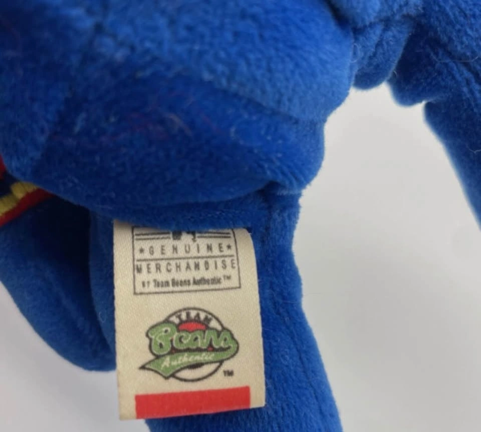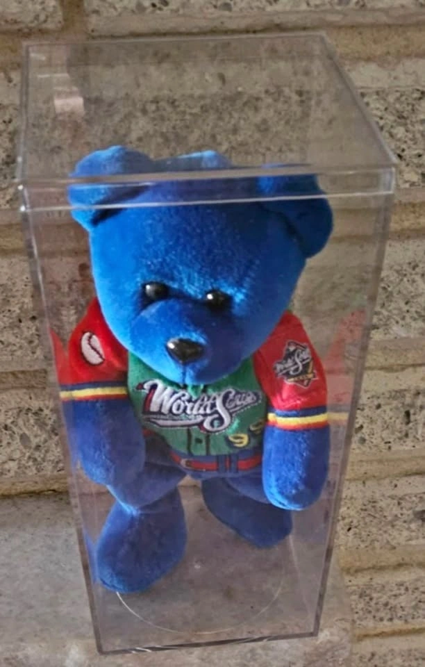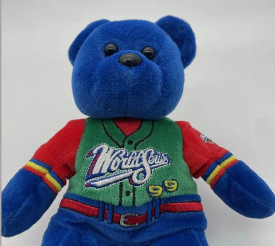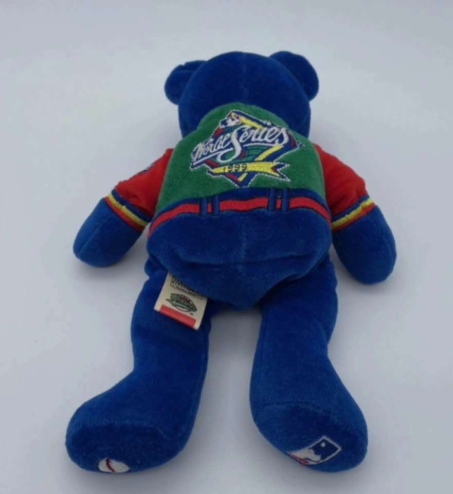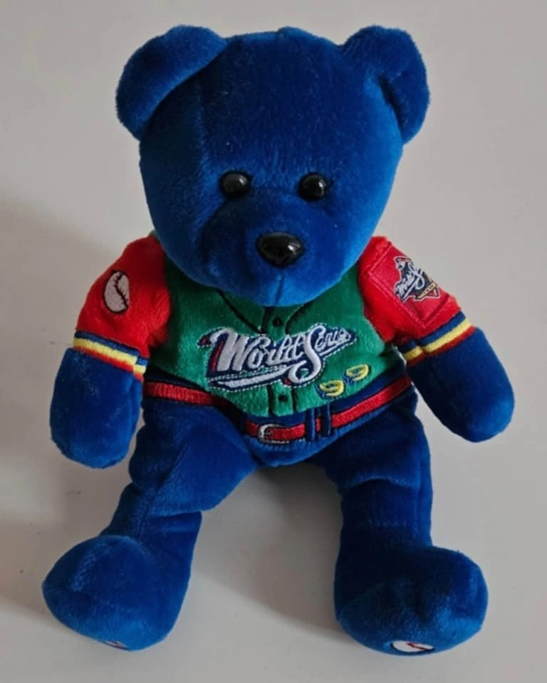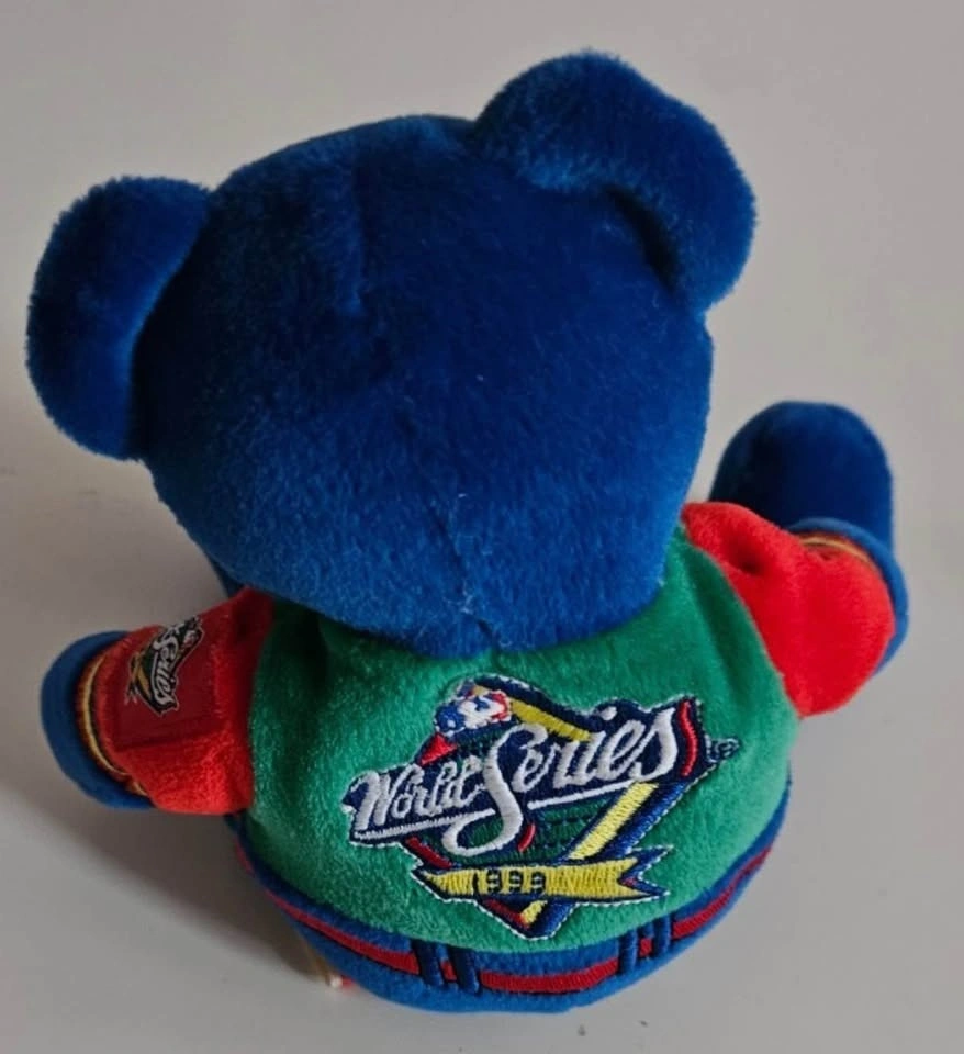 This bear is a 1999 World Series Major League Baseball bear, featuring the colors of the New York Yankees VS Atlanta Braves. Yankees defeated Braves, the 3rd of 5 World Series titles for Jeter. 25th World Series Title for Yankees. Officially licensed by MLB, this 8-inch bear is a must-have for fans of the team and the sport of baseball. This collectible item commemorates the team's victory in the 1999 World Series, making it a valuable piece for any sports memorabilia collection. The tag on the bear has been removed. This bear is in very good condition and comes in a plastic case.