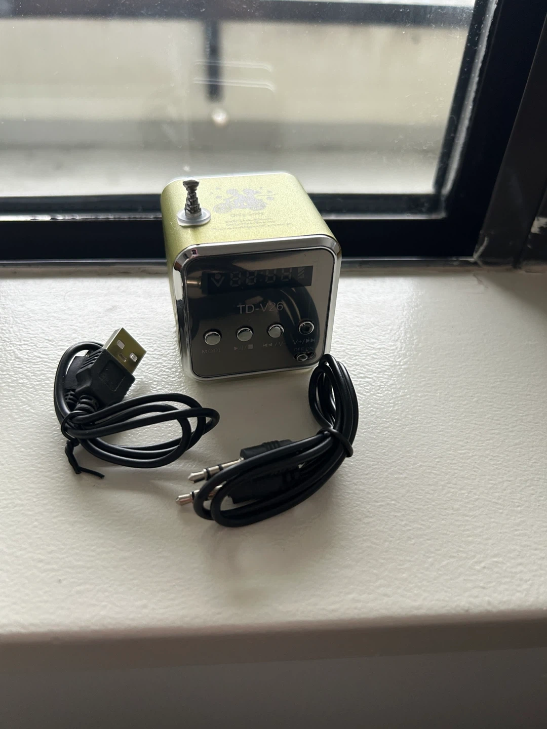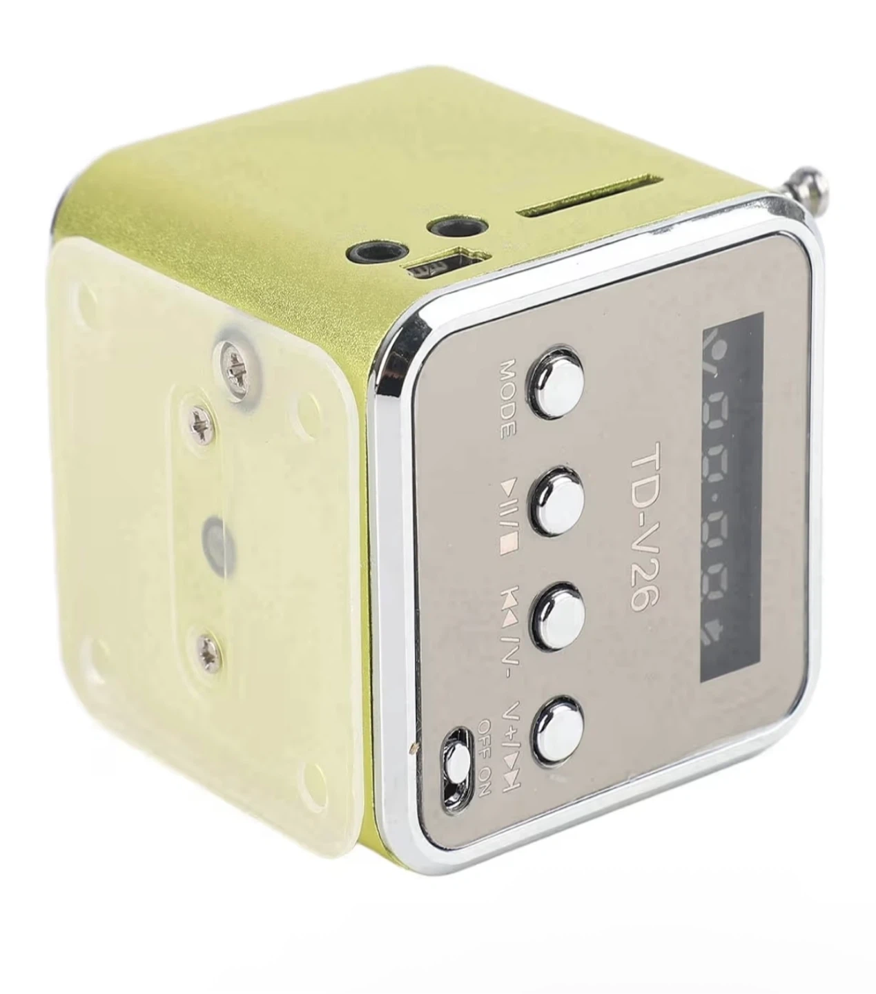 This is a TD-V26 mini portable speaker. It supports USB and SD card playback, and has an FM radio function. It's compact and lightweight for easy carrying.