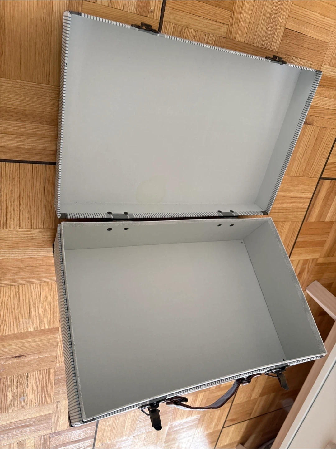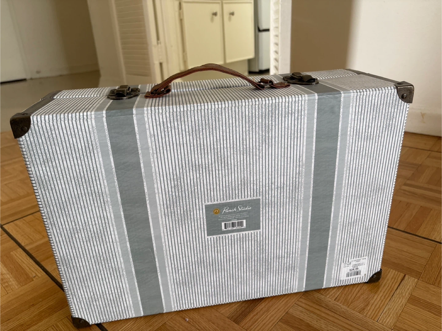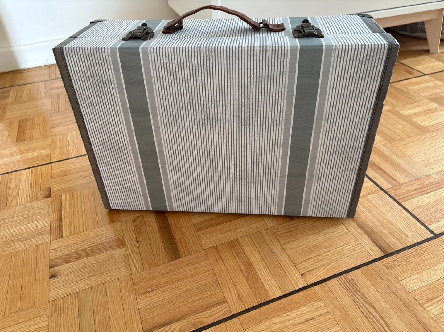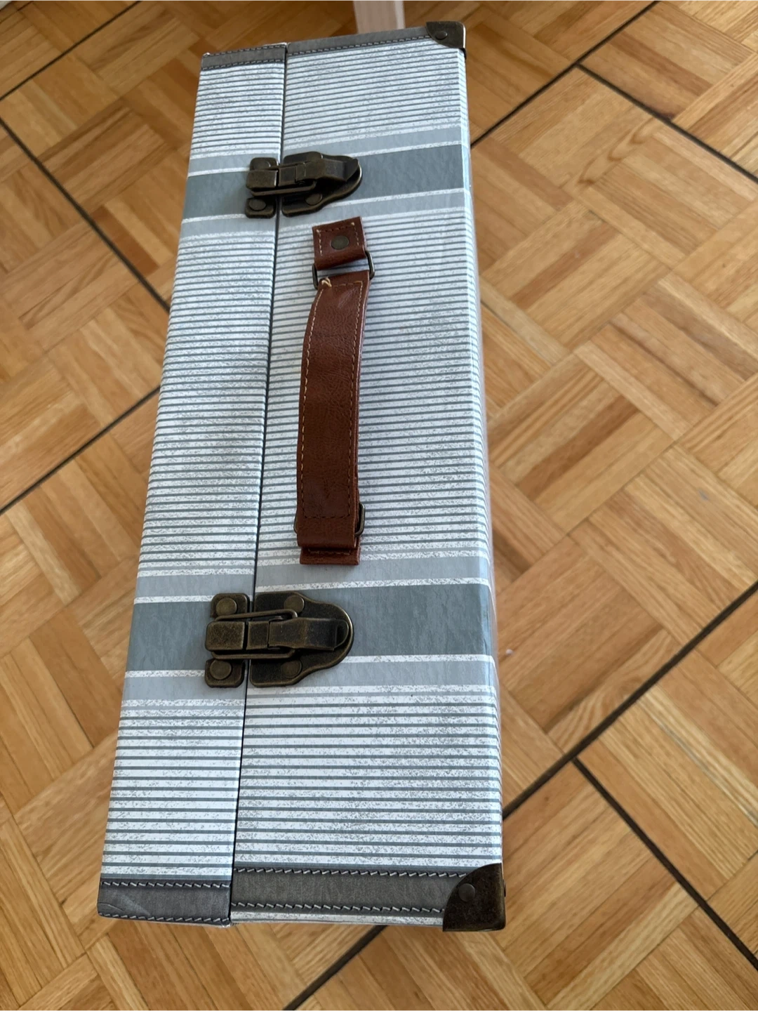 This is a decorative storage box with a striped design and a leather handle. It features two latch closures and metal corner protectors. It's perfect for storing keepsakes or small items.