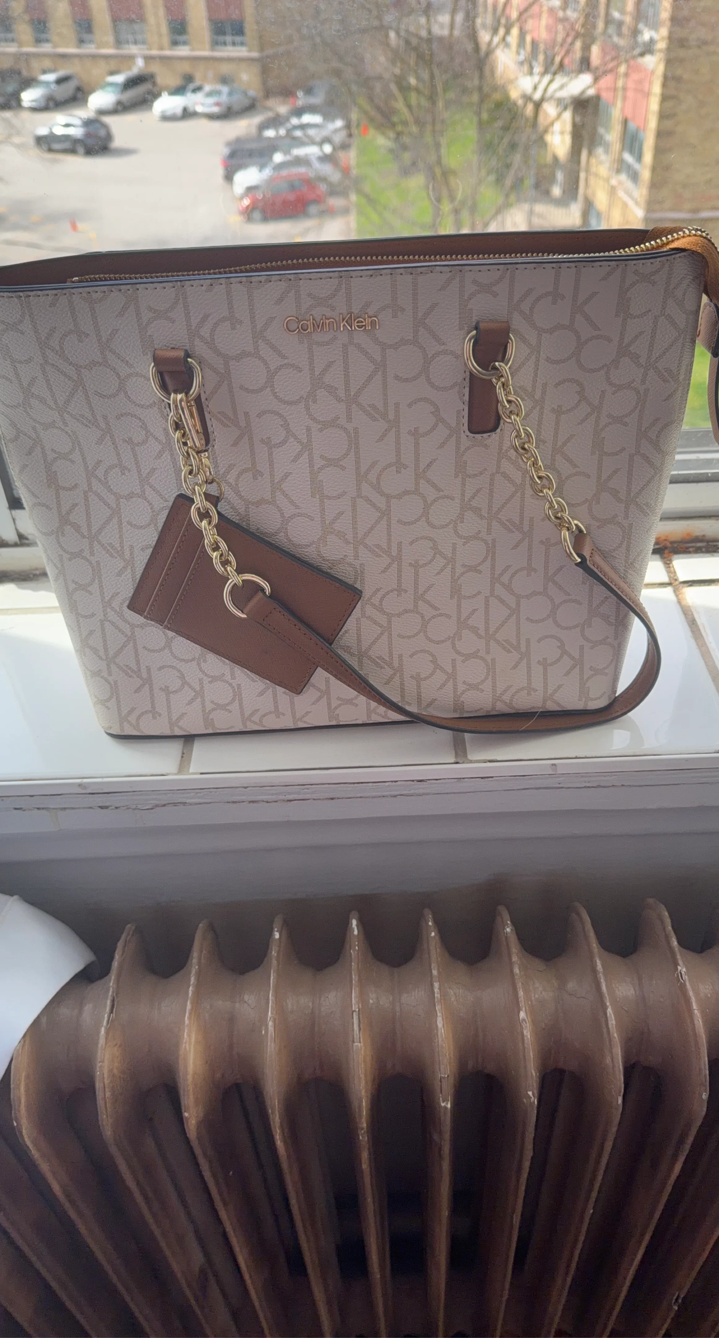 Stylish Calvin Klein tote bag featuring the signature monogram print. Comes with a matching cardholder for convenience. Leather trim and gold-tone hardware.