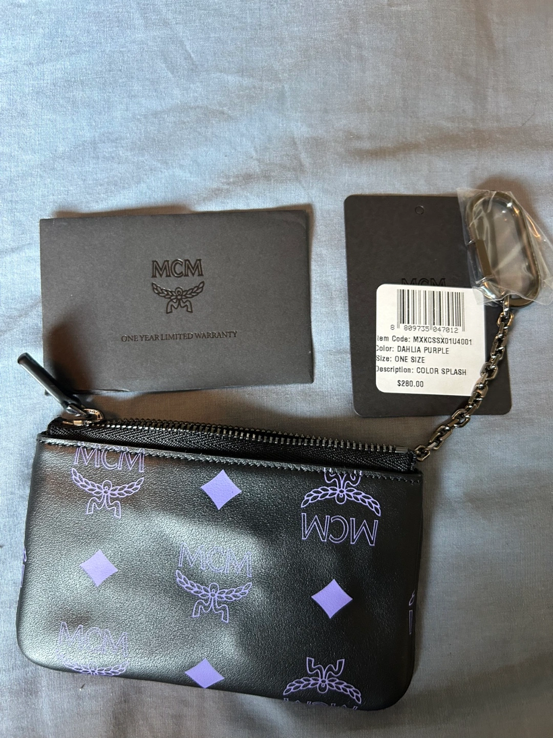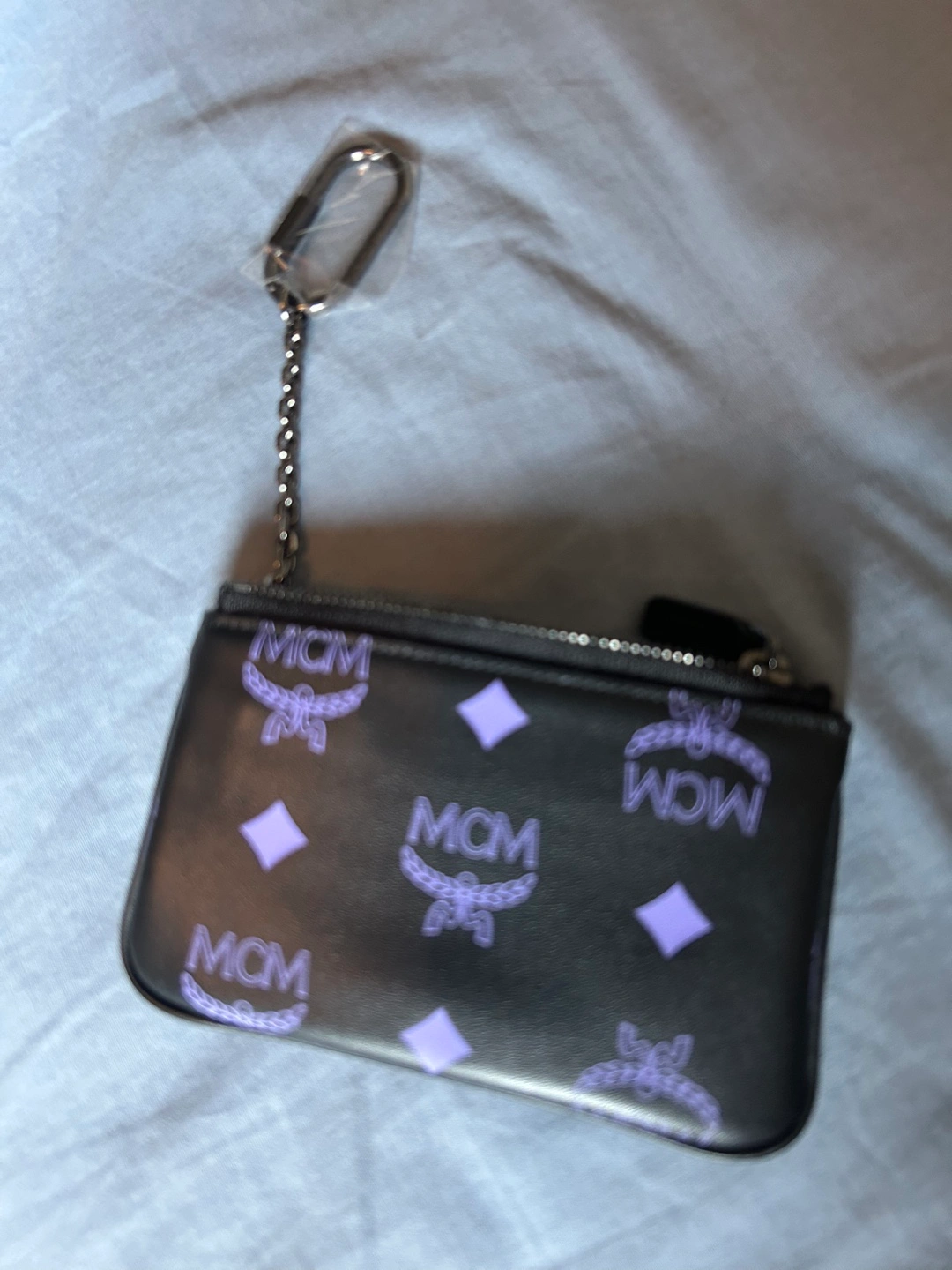 Small black pouch with a purple MCM logo. Features a zipper closure and a metal keychain. Includes dust bag and authenticity card. New with tags.