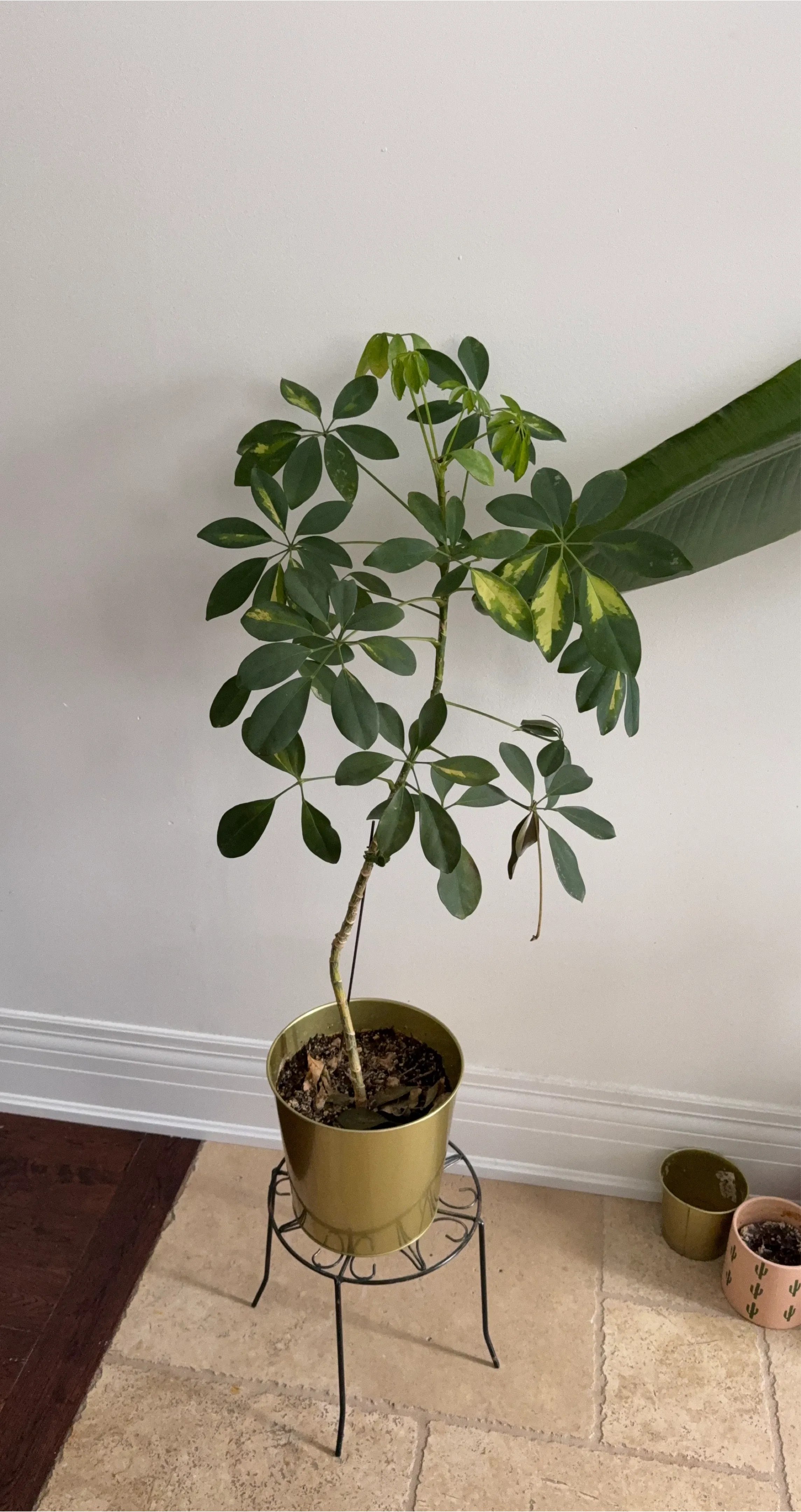 A Dwarf Umbrella Tree plant in a gold pot. The plant has variegated green and yellow leaves. Includes a decorative black plant stand. This plant thrives in bright, indirect light.