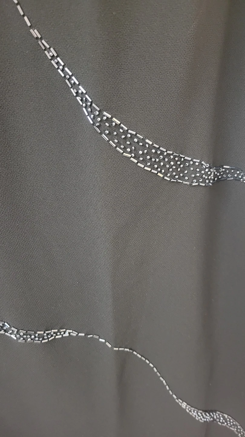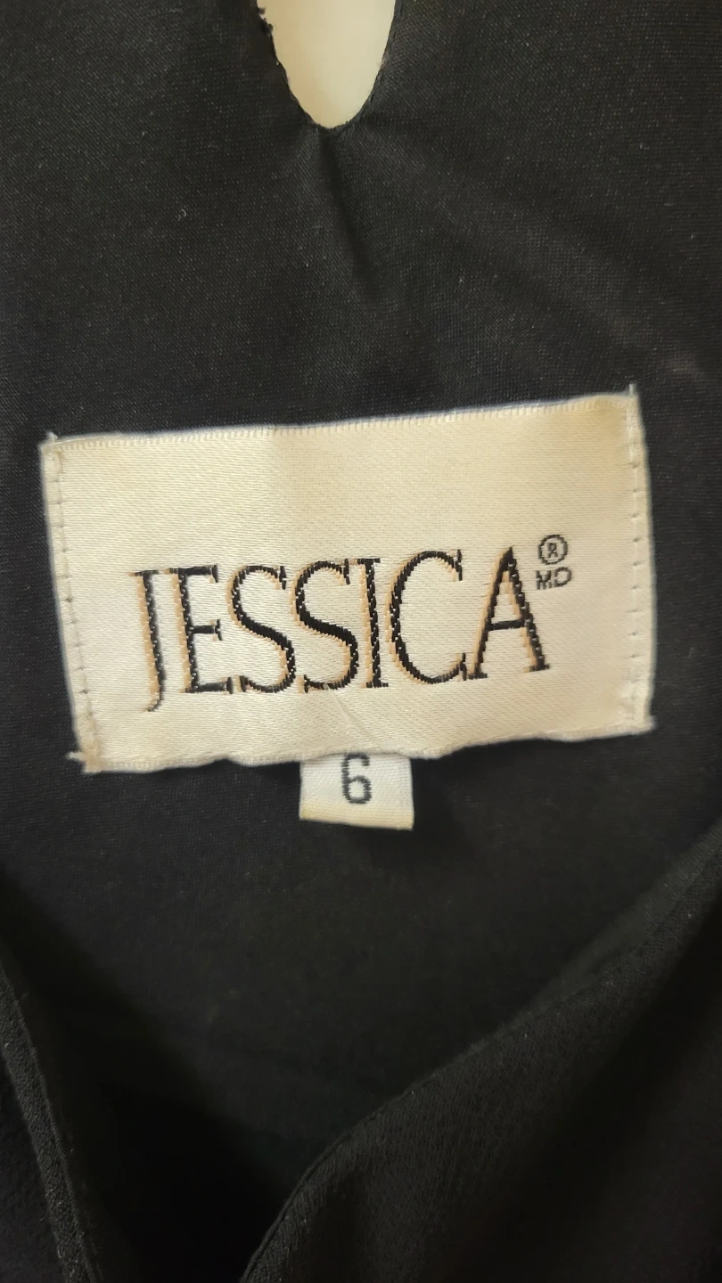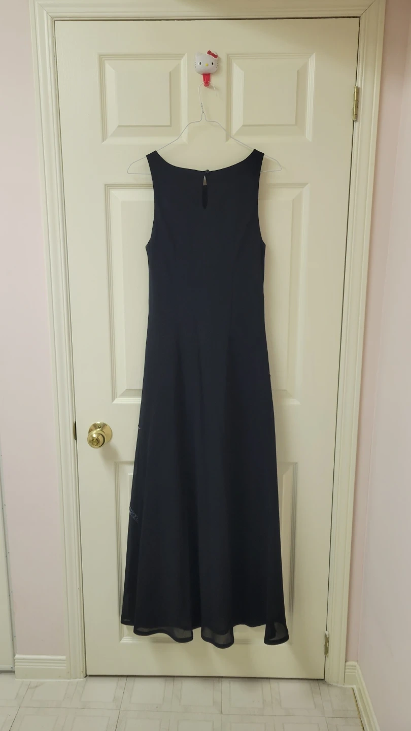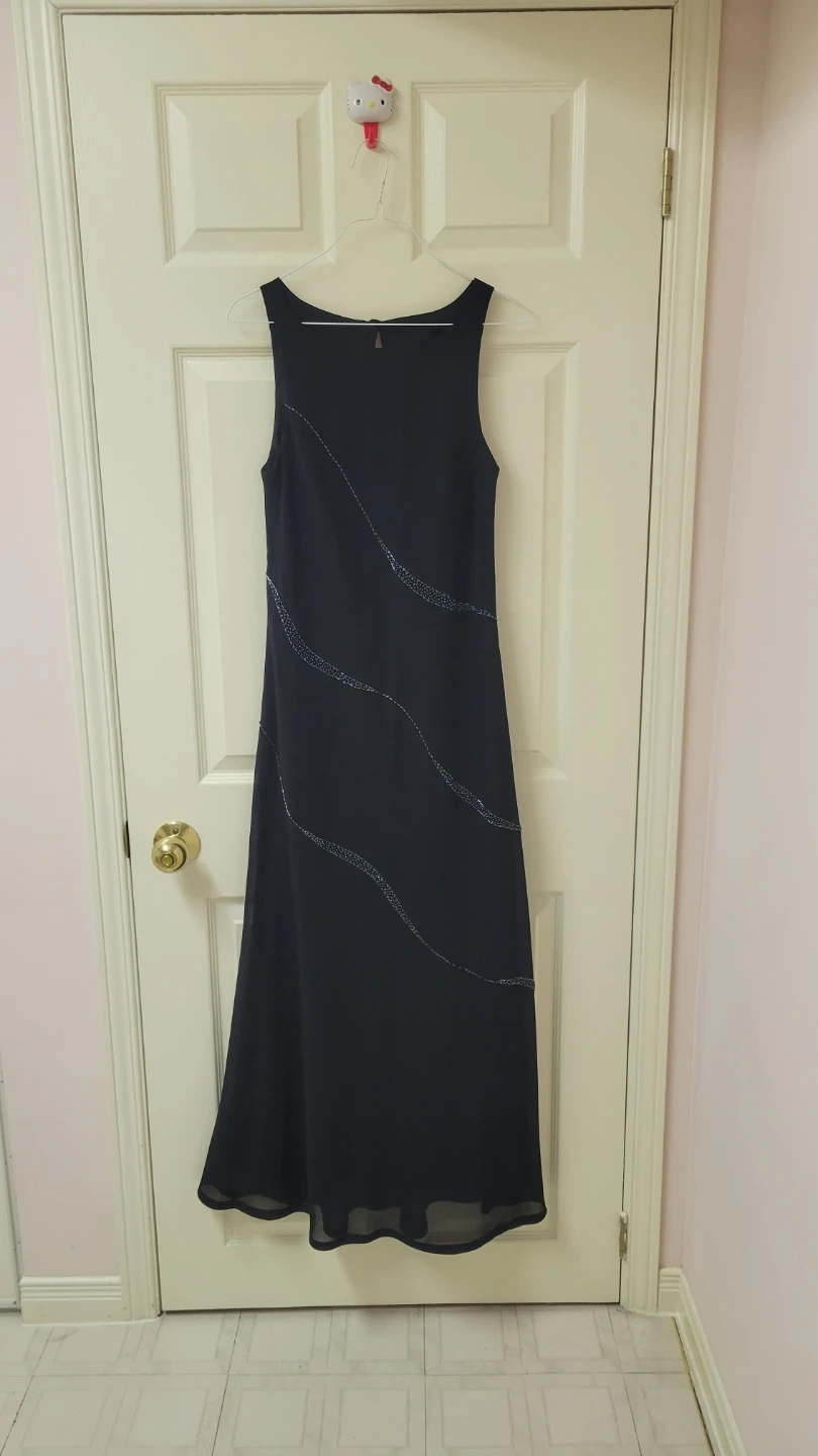 This Jessica dress is black and sleeveless. It features a maxi length with decorative beaded accents on the front. Size is 6.