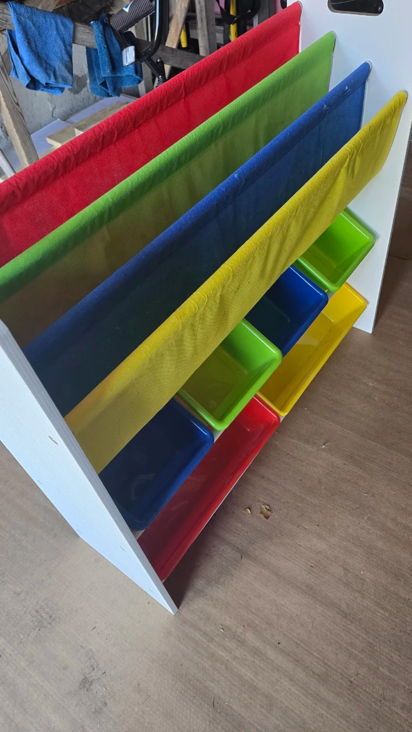 This is a kids' toy organizer shelf with multiple colourful compartments. It's made of white wood and fabric shelves with plastic bins. Great for storing books and toys!
