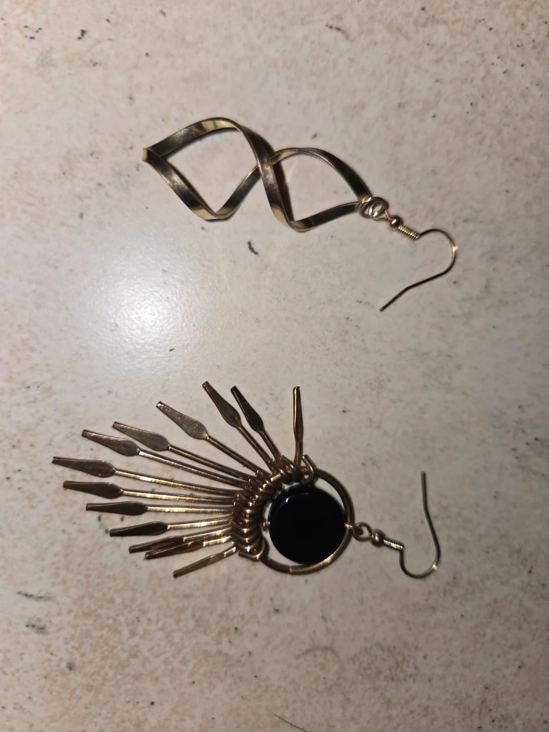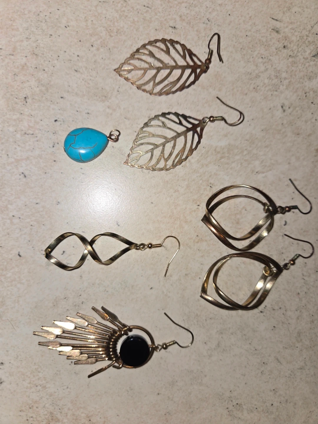 A collection of various pieces, including gold-tone earrings, leaf designs, a turquoise stone dangle pendant, a twisted rope style, circular abstract shapes, and a fan-shaped design with a black centre. These are great for adding a stylish touch to any outfit! Available for trade or purchase, separately or together. Make an offer on the one(s) you want!