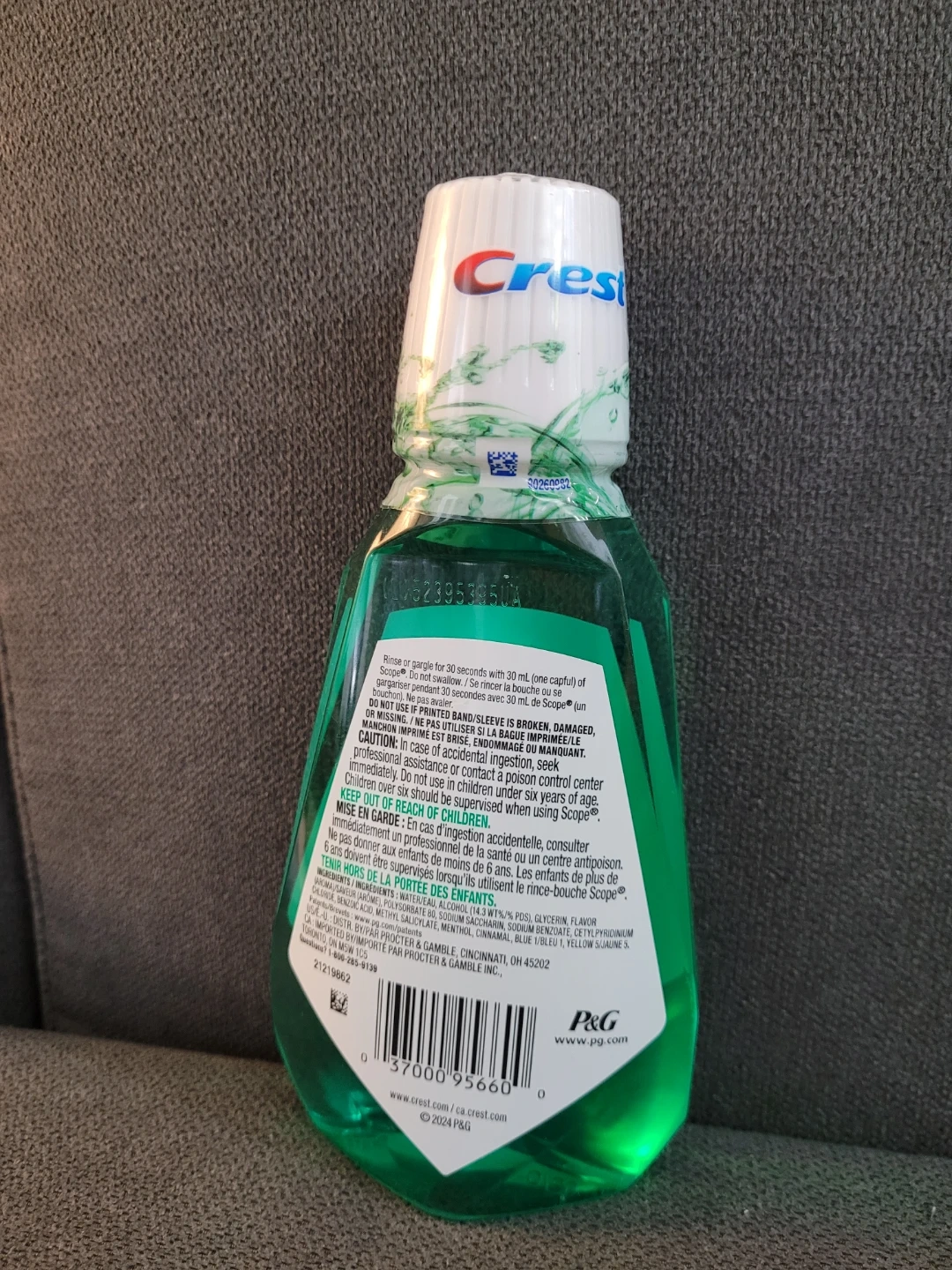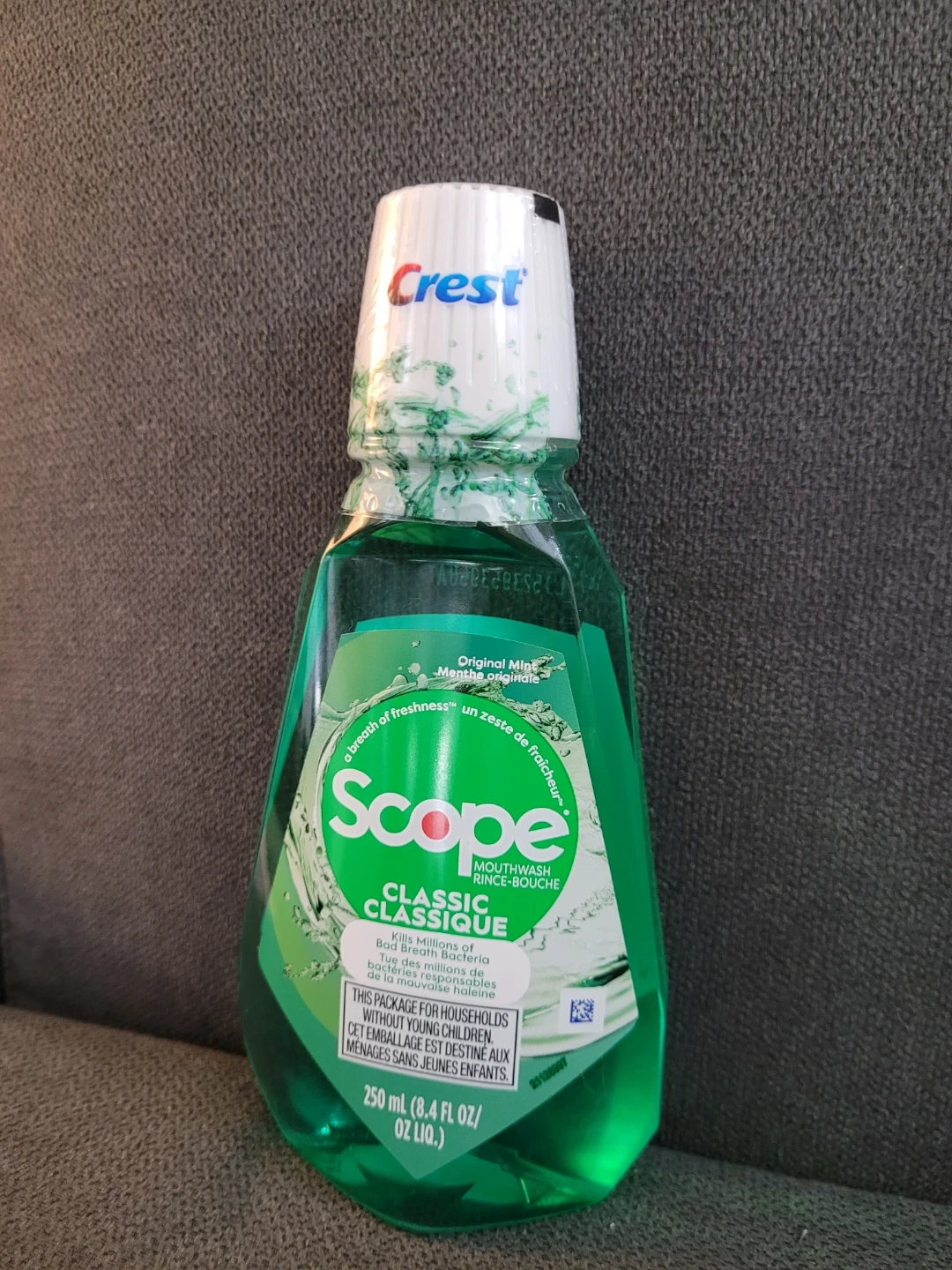 Crest Scope Classic Mouthwash in Original Mint flavour. It kills millions of bad breath bacteria. Use 30 ml for 30 seconds for a fresh breath. 250 mL (8.4 FL OZ) bottle.