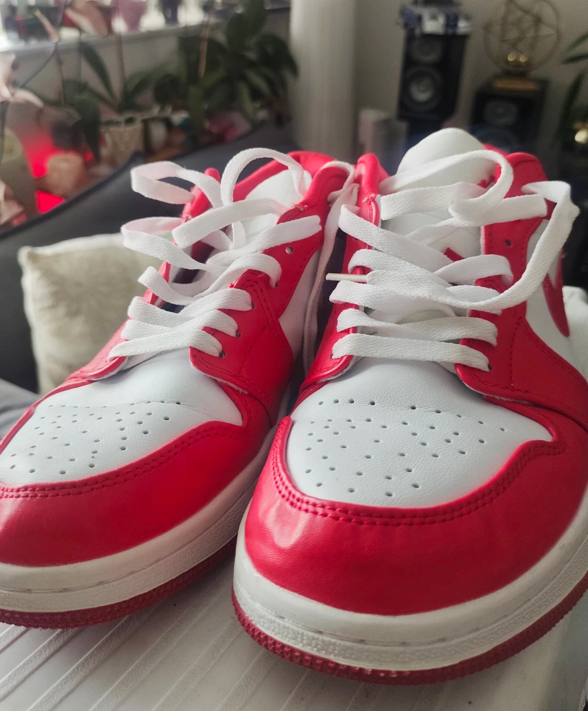 These are Air Jordan 1 Low sneakers in a classic red and white colourway. They're made with a leather upper and rubber sole. These kicks are perfect for everyday wear or hitting the court!