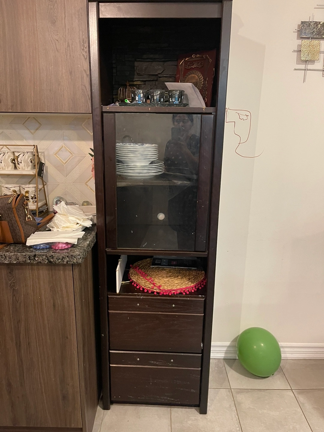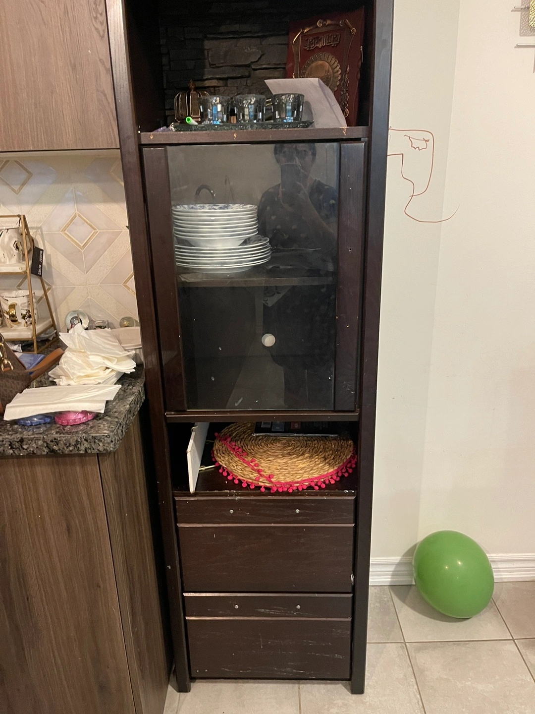 Tall, dark brown wooden cabinet. Features glass-fronted shelving and a lower drawer. Perfect for displaying dishes or other collectibles. Some minor wear.