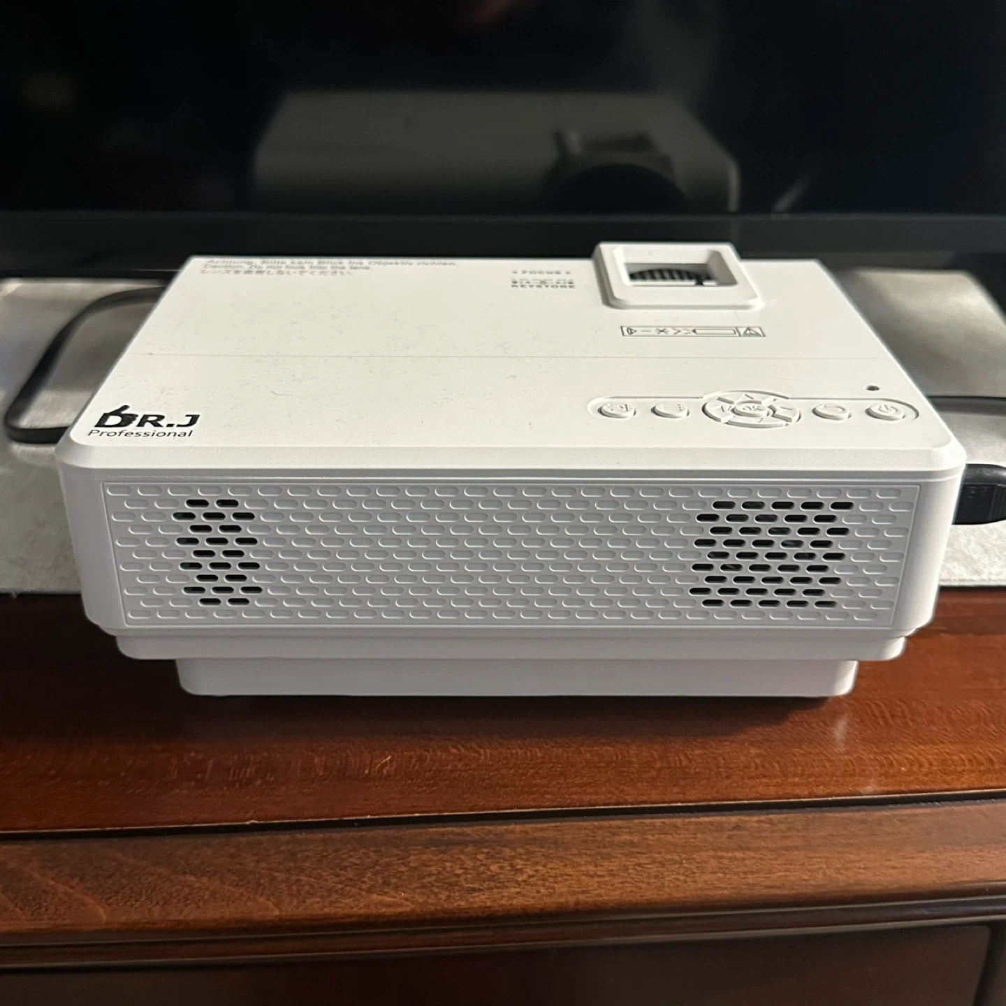 This is a DR.J Professional white projector. It features HDMI, USB, and VGA inputs. The focus and keystone adjustments are on top.