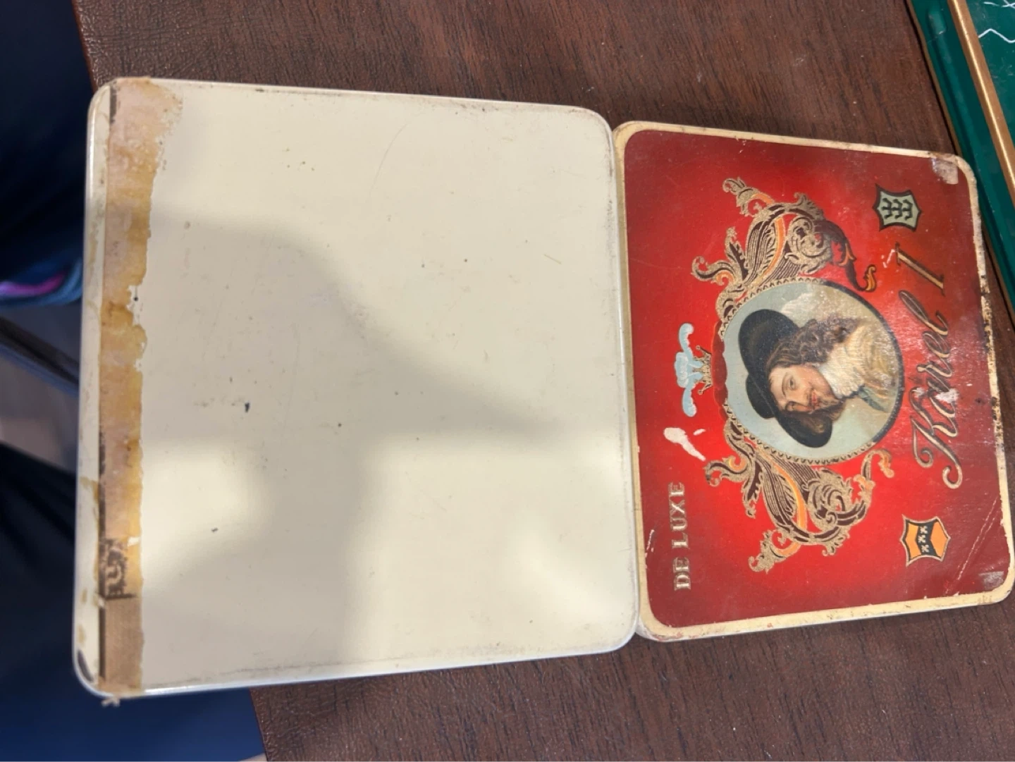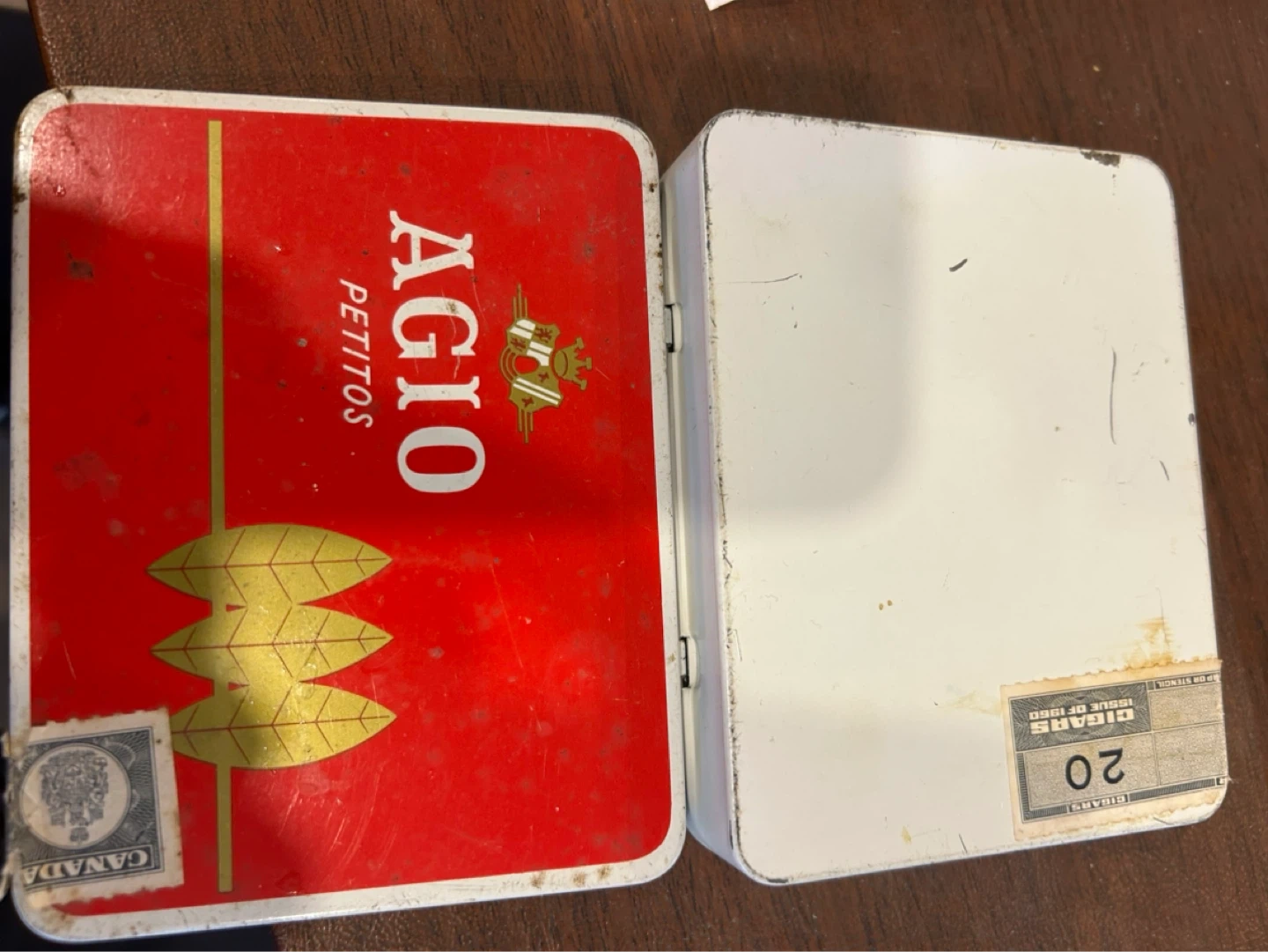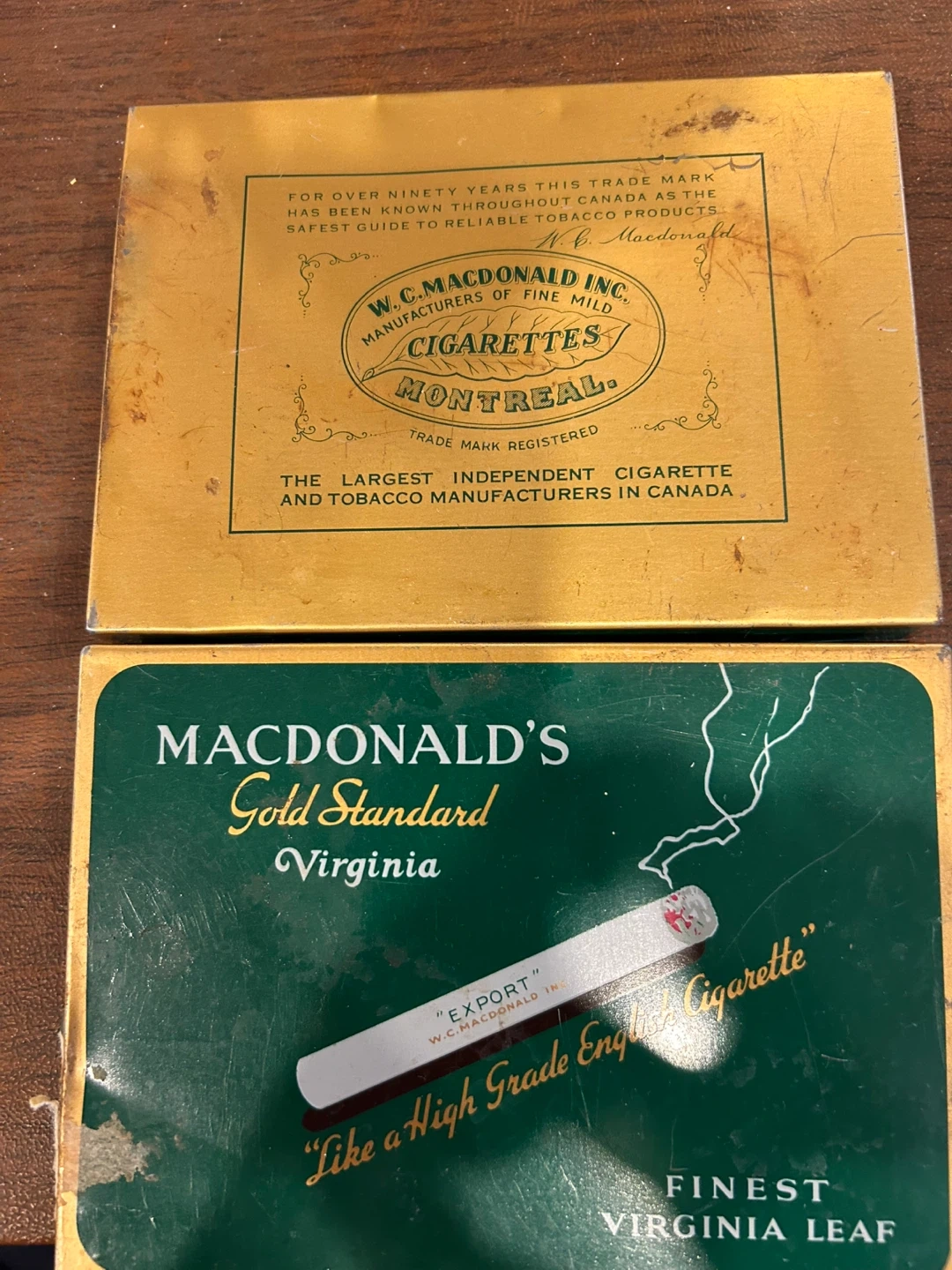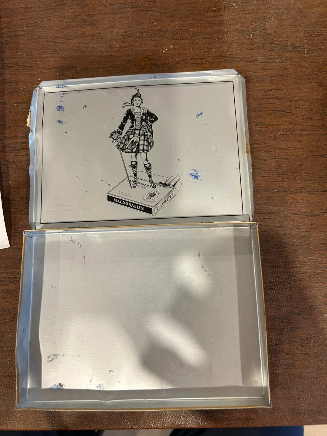 This is a vintage MacDonald's Gold Standard Virginia cigarette tin. It features "Like a High Grade English Cigarette" text and imagery of a cigarette. The tin also has a decorative graphic of a Scottish Highlander inside the lid. Made by W.C. MacDonald Inc. in Montreal, Canada, it's a piece of Canadian tobacco history.