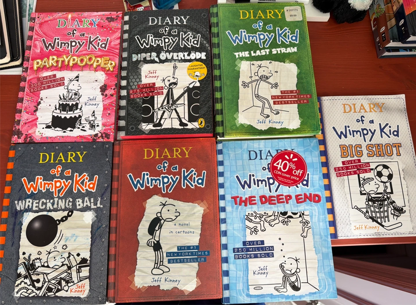 This listing includes several books from the Diary of a Wimpy Kid series by Jeff Kinney. Titles like Party Over, Diaper Overload, The Last Straw, Wrecking Ball, Big Shot, and The Deep End are available. These novels are written in cartoons and are New York Times bestsellers.