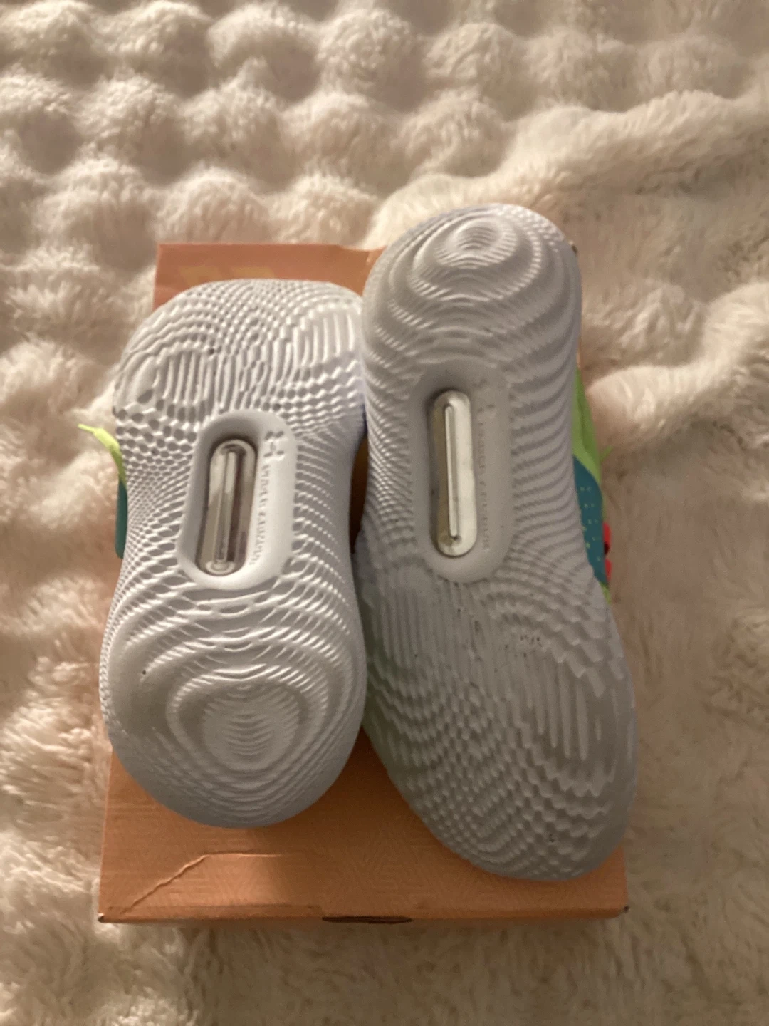 These vibrant neon green and blue Under Armour youth shoes are built for performance. They feature a secure strap closure and durable sole. Perfect for active kids who need reliable footwear.