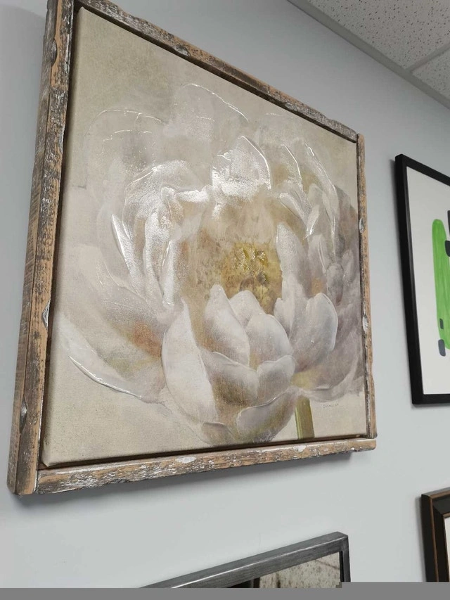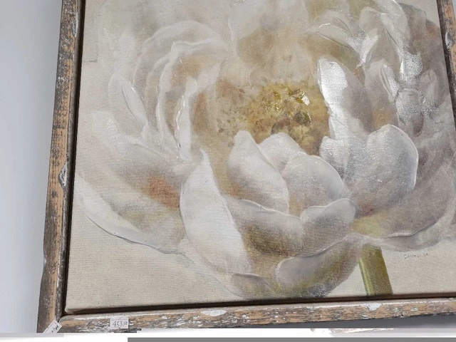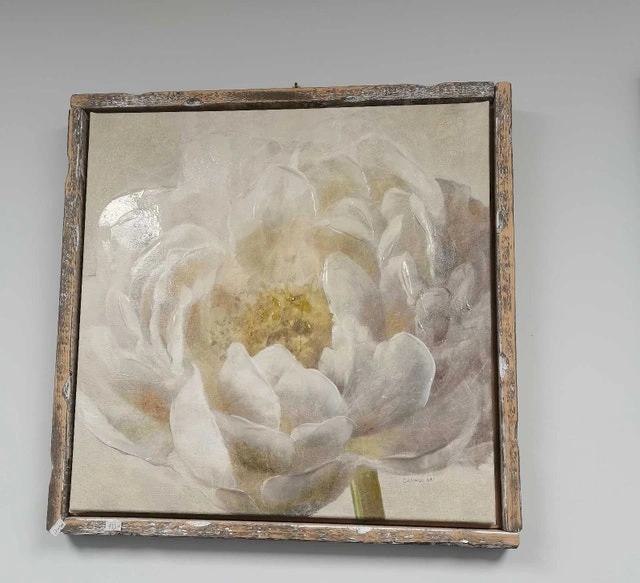 Acrylic painting, solid wood rustic frame super thick 2" hand painting, vivid with brush strokes Angel's wing I the billowy and airy apperance of white peony flower, it is pure white color and ethereal beauty is as close to angel's wing as i can find in this world. size: 24.5"x24.5"x2" Style: Realism by DANhui nai