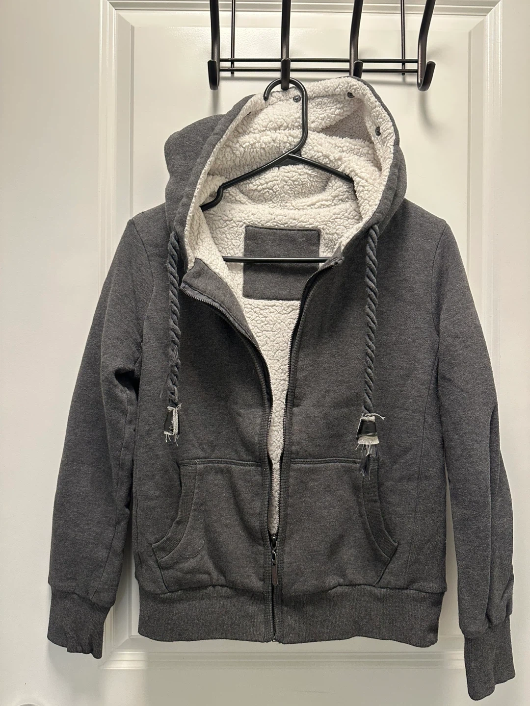 This charcoal grey zip-up hoodie features a cozy sherpa lining throughout. It has a full zip closure and front pockets. The drawstring on the hood has decorative braided detail. Very warm and comfy. Size S.