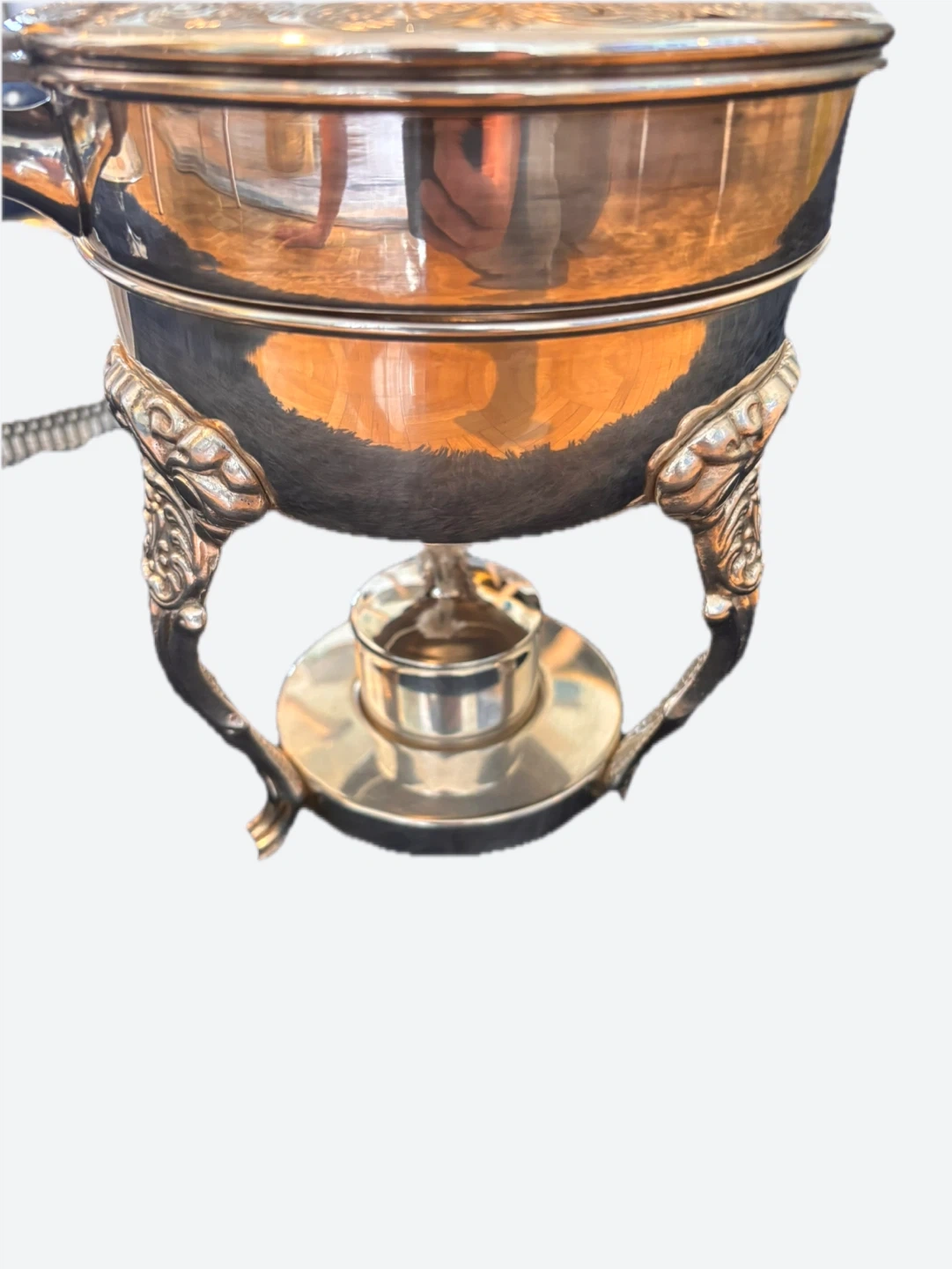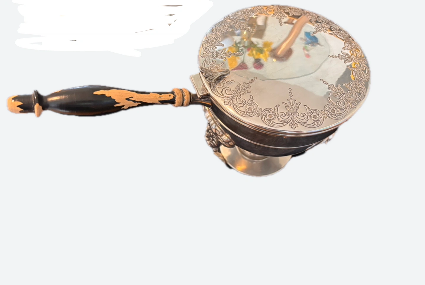 This silver-plated chafing dish features intricate scrollwork and ornate detailing. It comes with a removable fuel holder for warming food. The wooden handle is attached to a hinged lid. It's a beautiful piece for serving at gatherings!