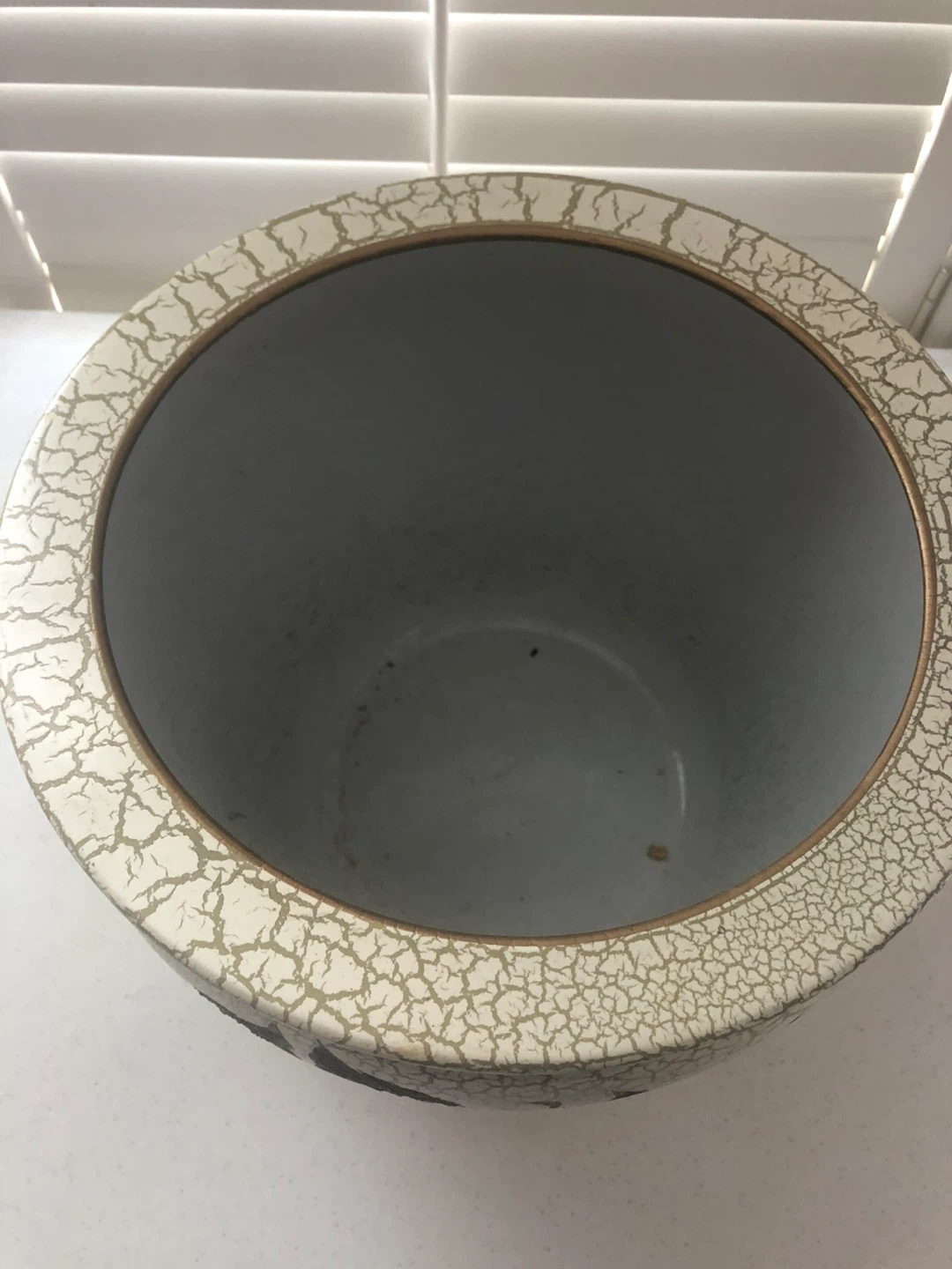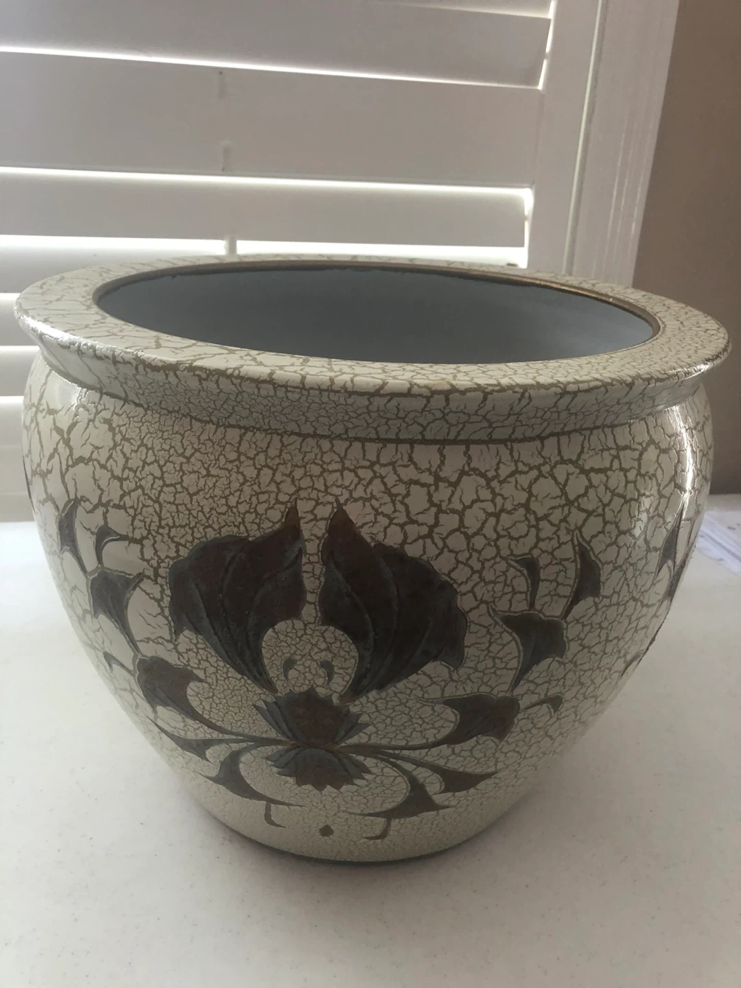 This is a decorative ceramic planter pot with a crackle glaze finish and floral design. It's suitable for indoor plants or as a decorative accent piece. Approximate diameter is 10 inches.