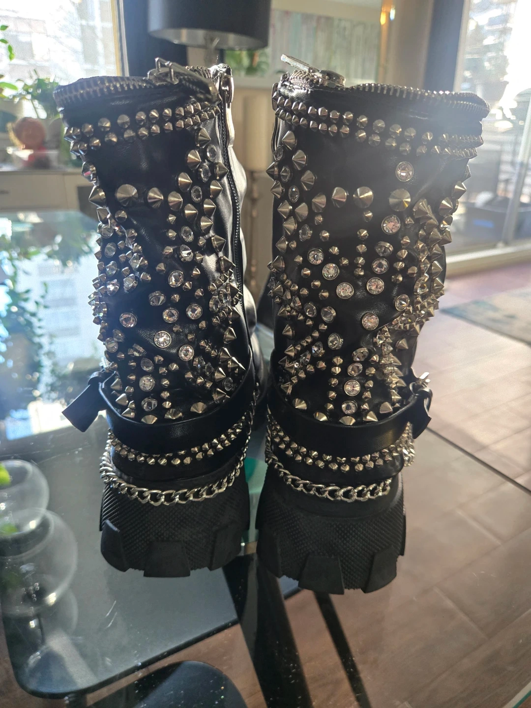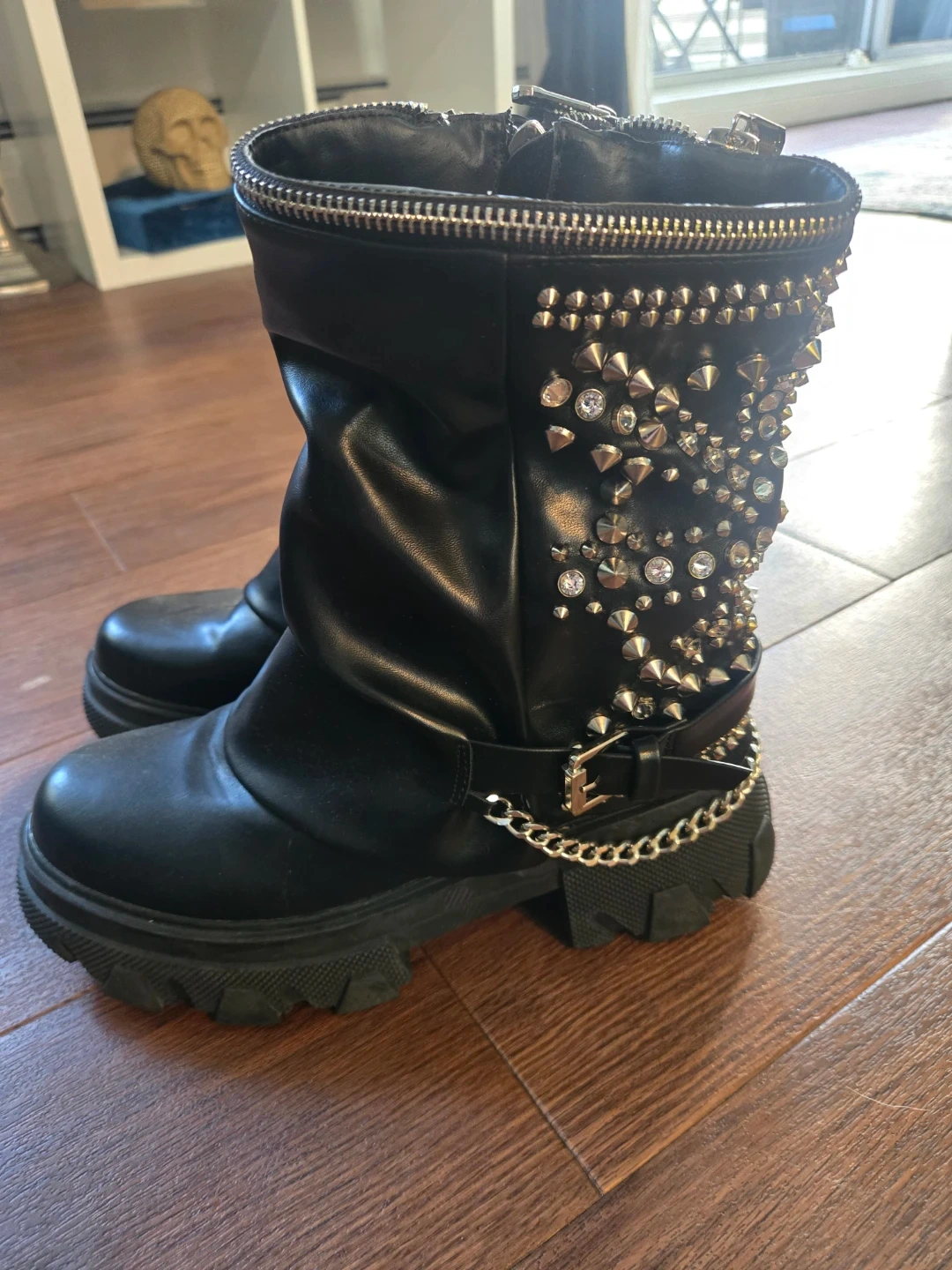 These black platform boots feature an edgy design with multiple studs and a detachable chain accent. They zip up the front for easy wear. It's a statement piece for any outfit! Brand new/never worn paid 200 from dolls kill.
