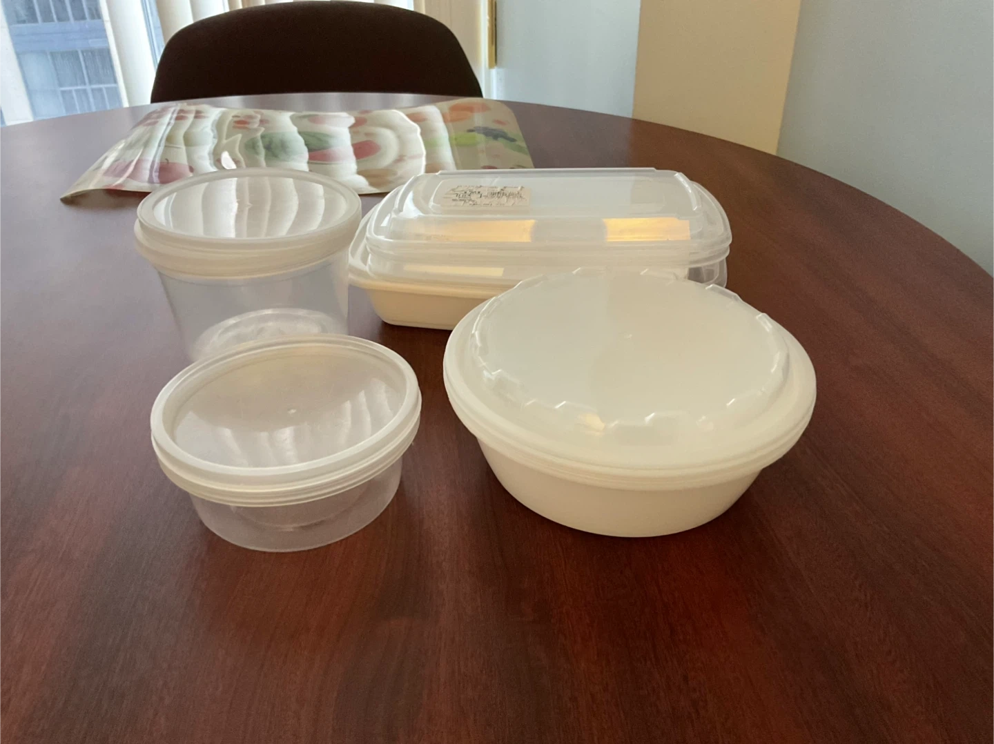 A set of assorted plastic food storage containers. Includes two round clear containers with white lids and two white rectangular containers with clear lids, two medium round and one small round container, all with lids. They're all clean and great for leftovers or meal prep!
