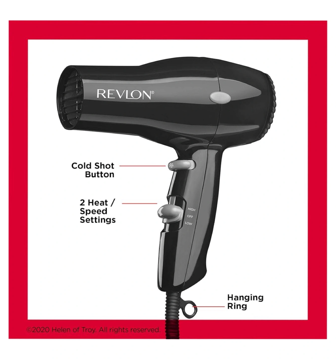 Black hair dryer with two heat/speed settings and a cold shot button. Includes a hanging ring.