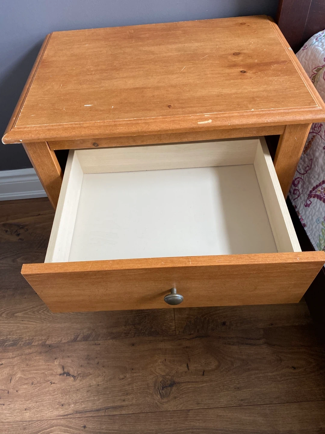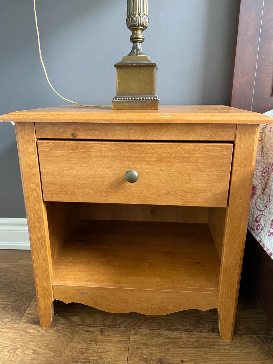 This is a simple wooden nightstand. It has one drawer and an open shelf below. It's made of wood and has a light wood finish. Good for storing items beside your bed.