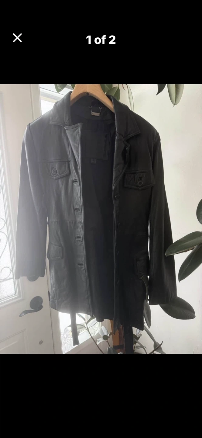 This is a black leather jacket with a button-up front and multiple pockets. It's made of genuine leather. This jacket is perfect for cooler weather.