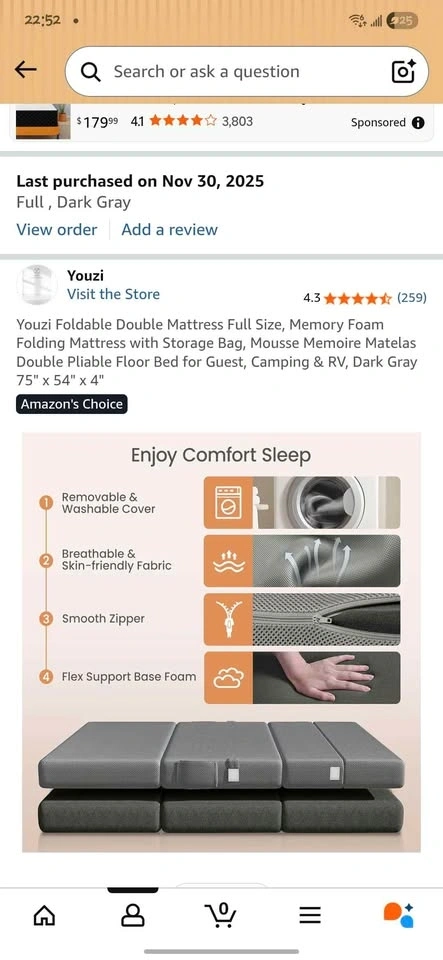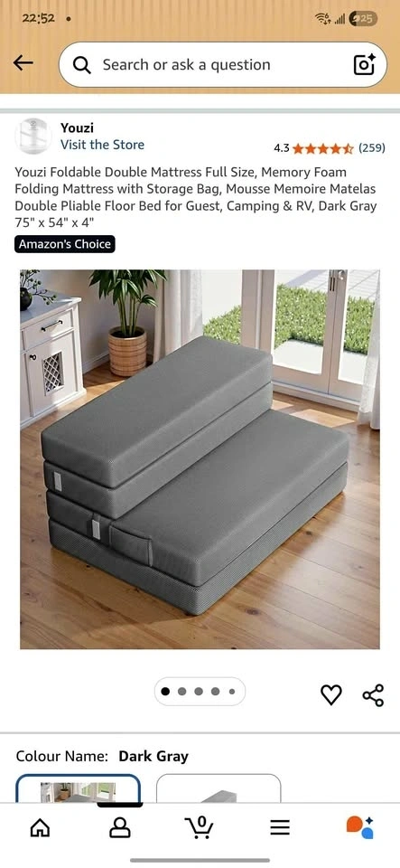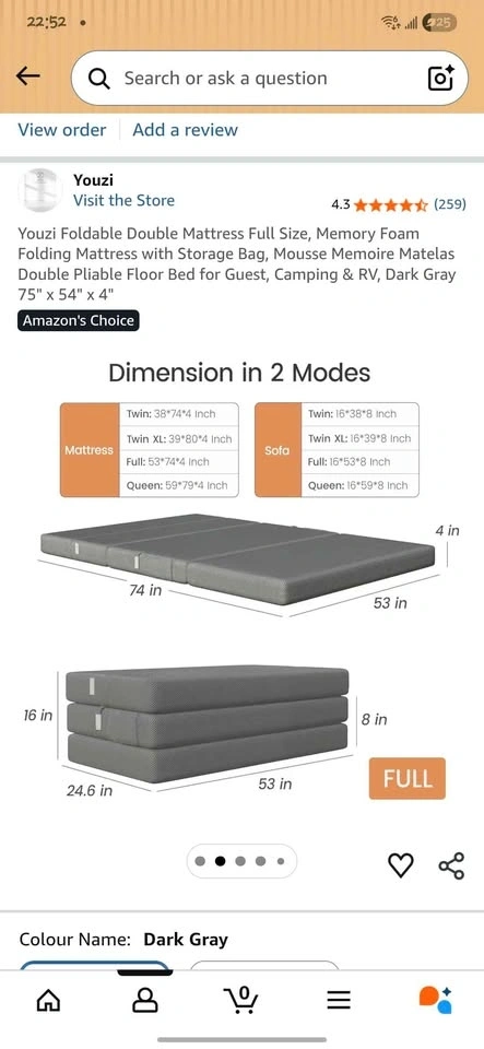 Versatile Youzi foldable double mattress. Full size, dark gray memory foam. Super comfy for guests, camping, or RV trips. Also works great as a floor bed or a sofa when folded up. Has a removable and washable cover, breathable fabric, and a smooth zipper. Dimensions are 75" x 54" x 4" as a mattress, or 53" x 24.6" x 16" as a sofa.