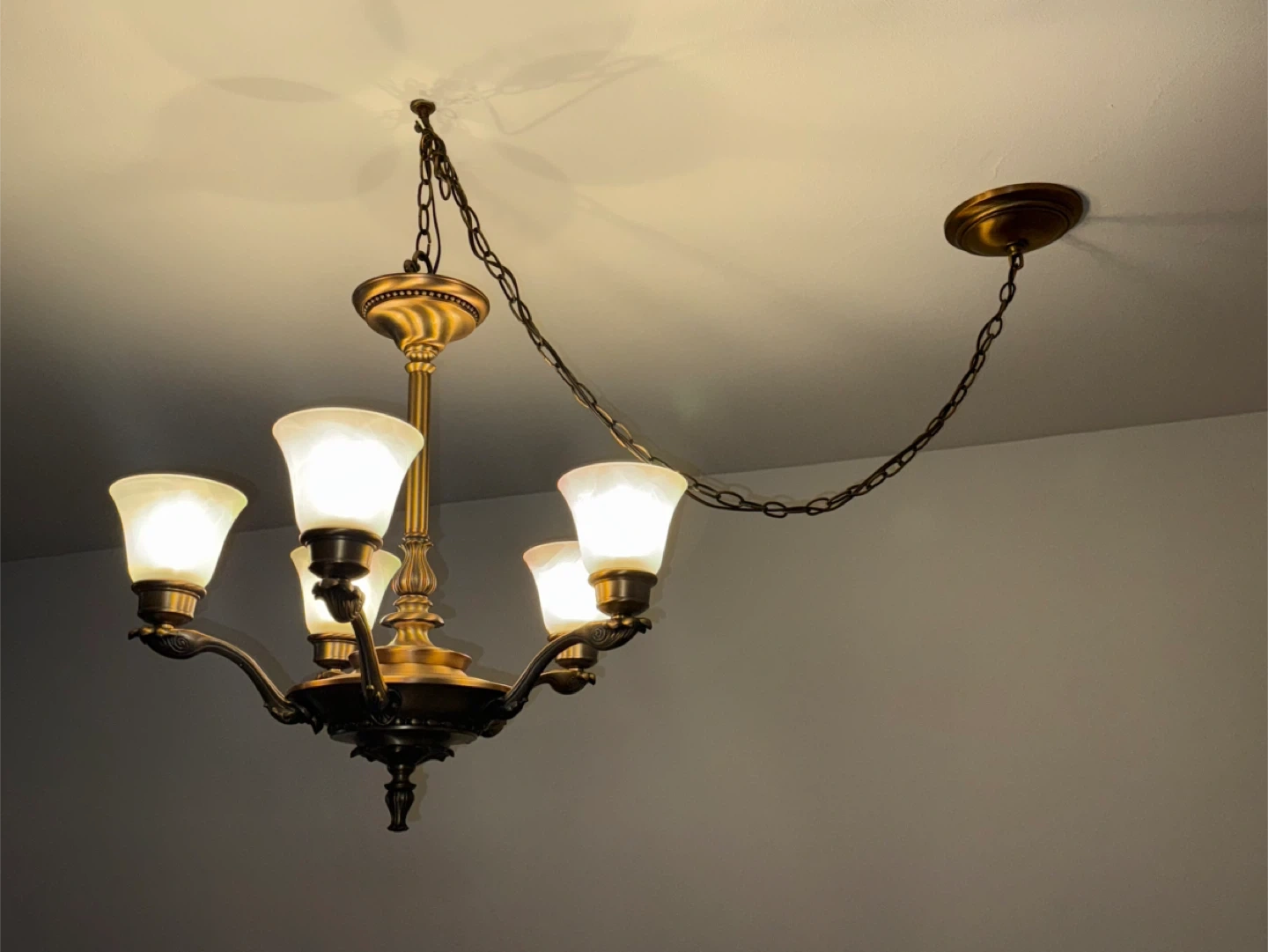 Brass finish chandelier with five frosted glass shades. This fixture provides warm ambient lighting. Perfect for dining rooms or living areas!