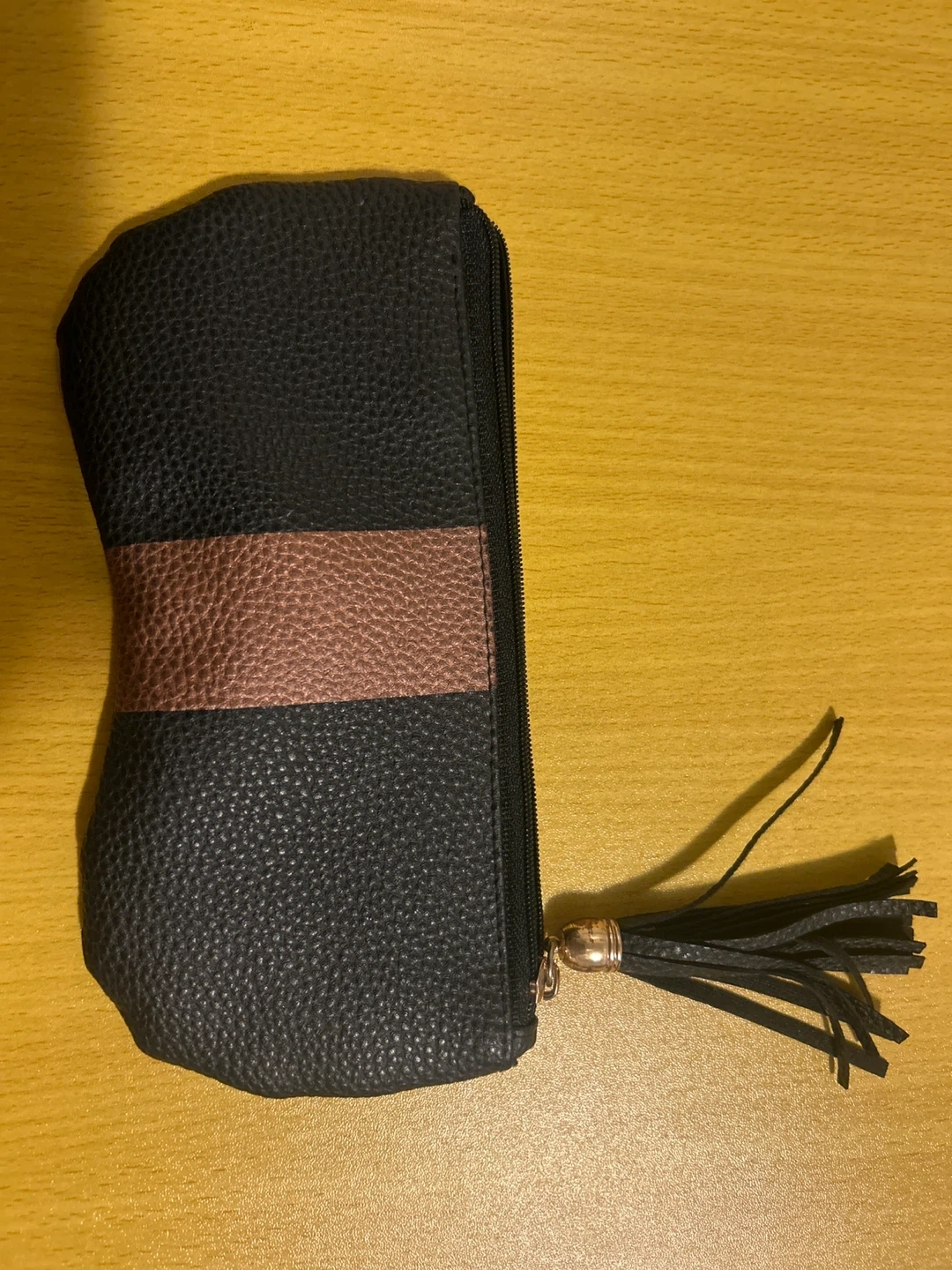 This black faux leather pouch features a textured finish and a rose gold stripe detail. It has a zipper closure and a decorative tassel. Perfect for keeping small essentials organized on the go!