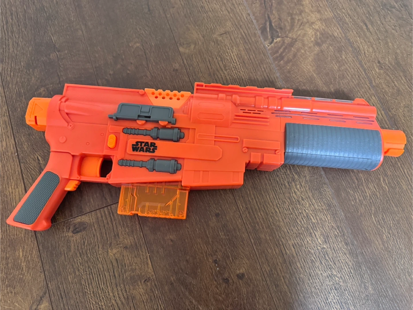 Three Star Wars themed blaster toy guns. Includes one orange and grey blaster with a clear attachment, one white and blue blaster with a detachable stock, and one red and grey blaster with a removable magazine. They're fun for play or collecting!