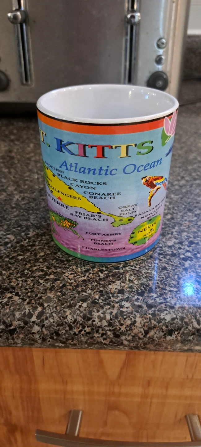 Ceramic mug featuring a map of St. Kitts and Nevis. It shows various locations like Basseterre, Charlestown, and Conaree Beach. The design also highlights the Atlantic Ocean.