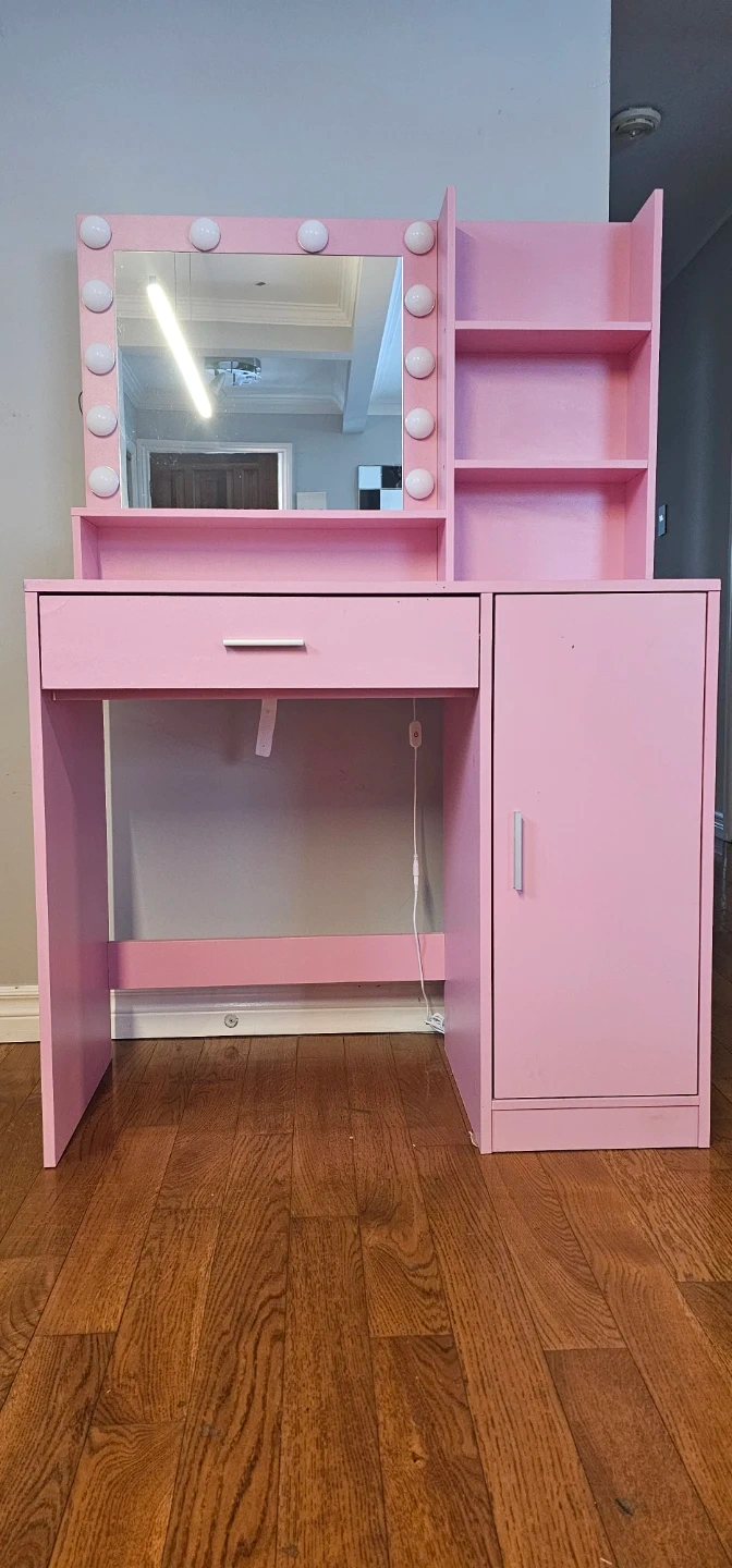 Stylish pink vanity table with morror. It offers a large drawer and 3-level storage for your makeup station. This desk has ample space with a cabinet and open shelving.
