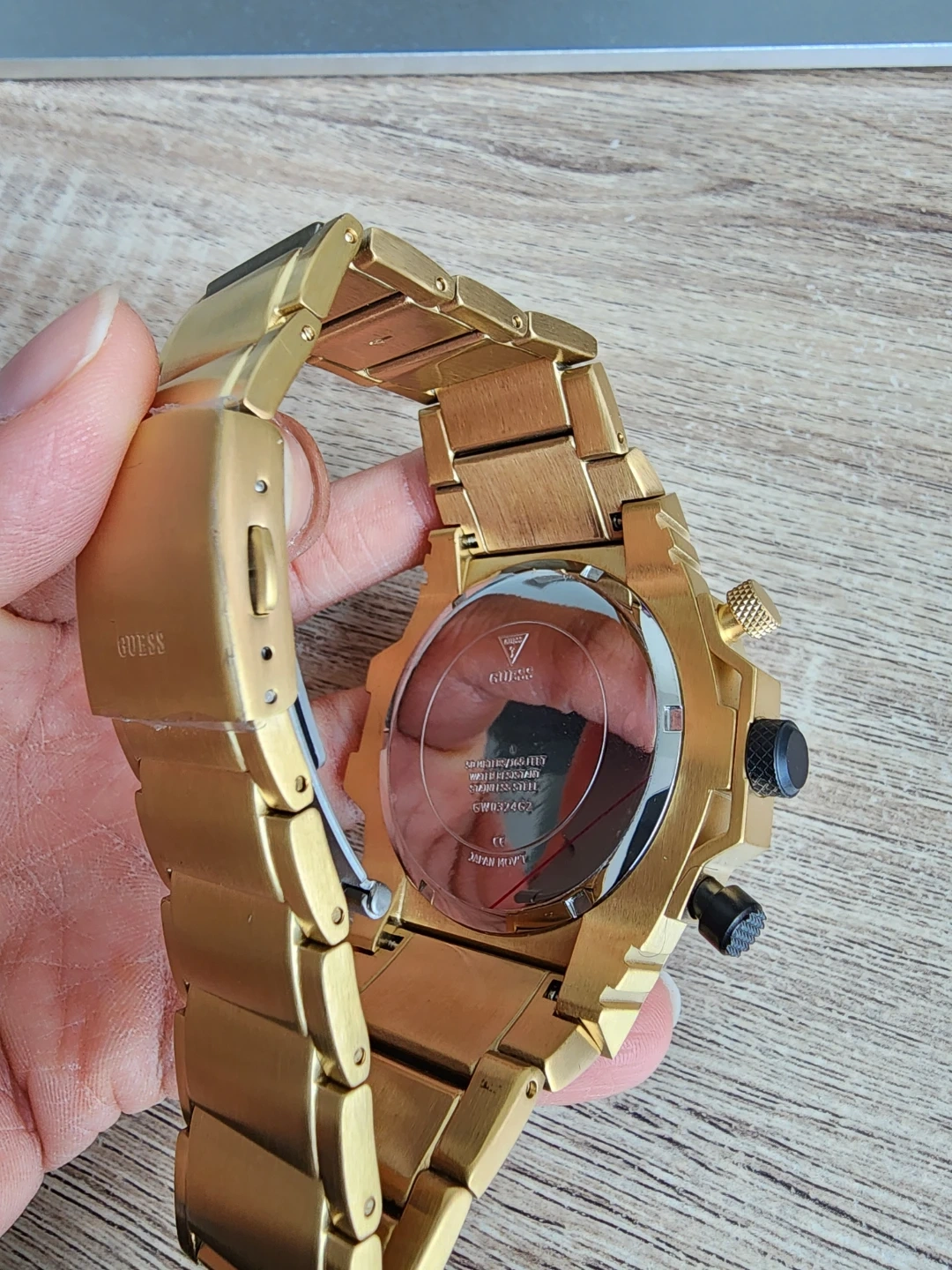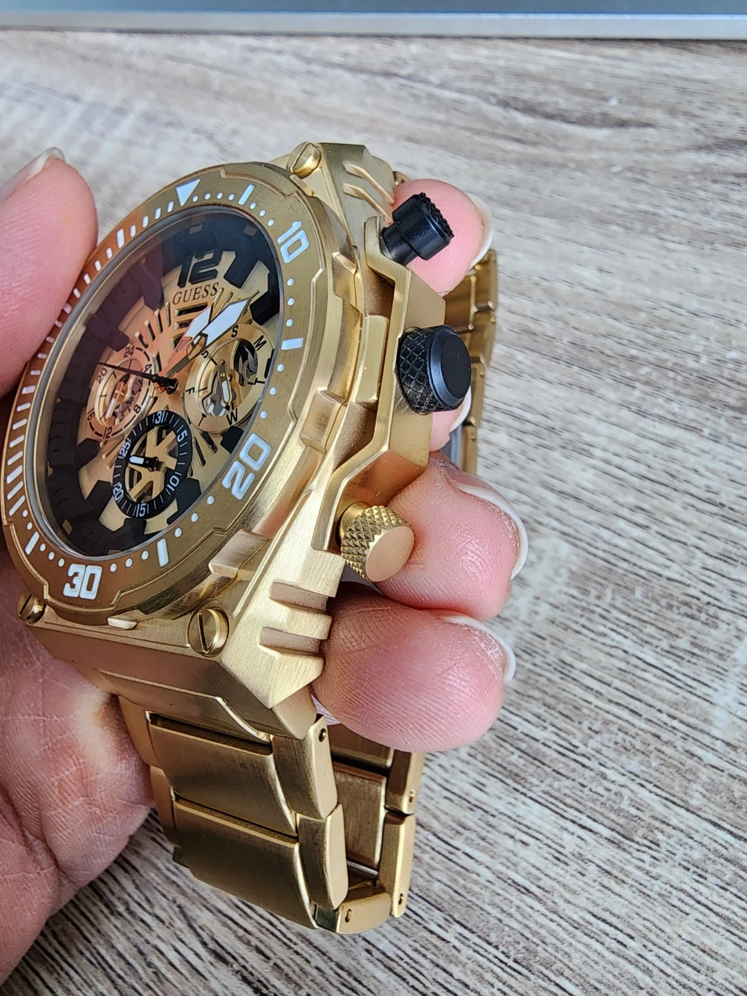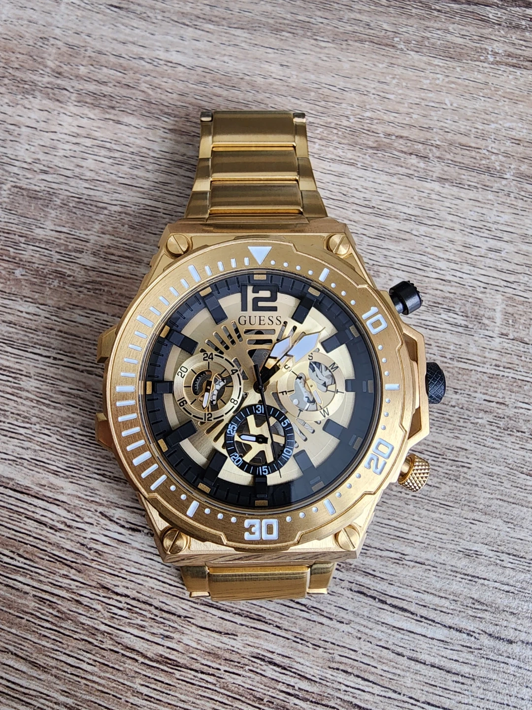 Gold-tone Guess watch with a black and gold dial. It features multiple subdials and a stainless steel band. This watch is a bold accessory for any outfit.