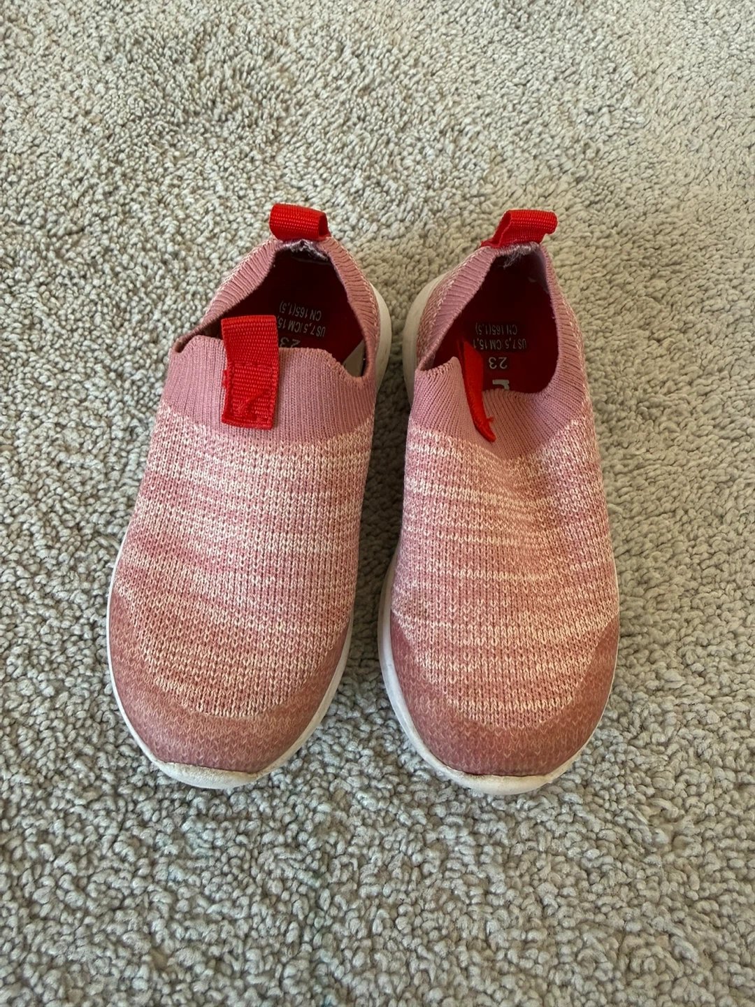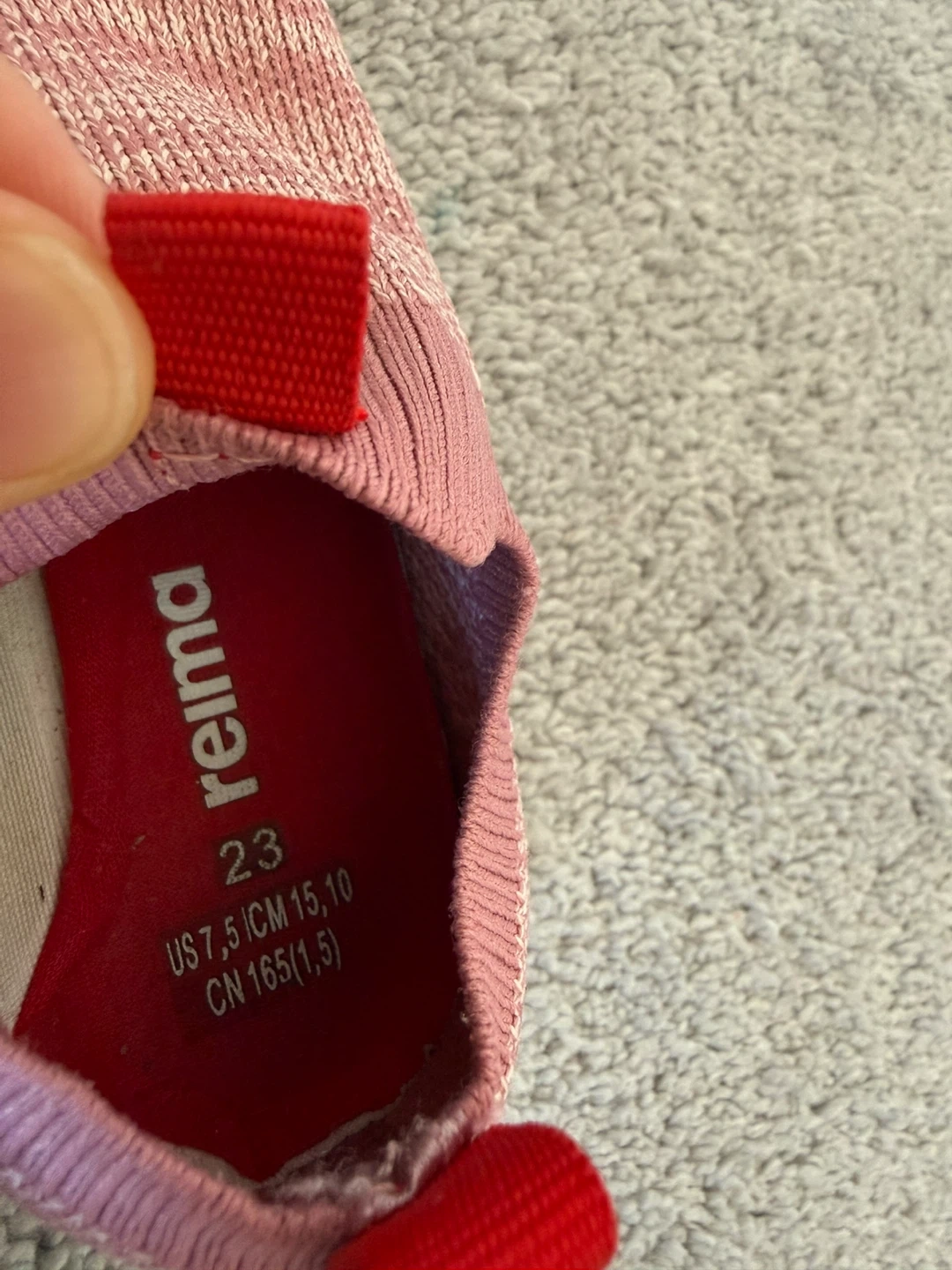 These Reima slip-on shoes are a cute pink knit. They're size 23, which is equivalent to a US 7.5, 15 cm, or CN 165(1.5). Perfect for little feet on the go!