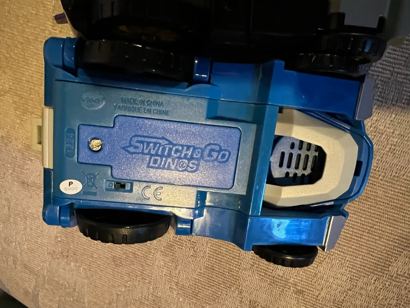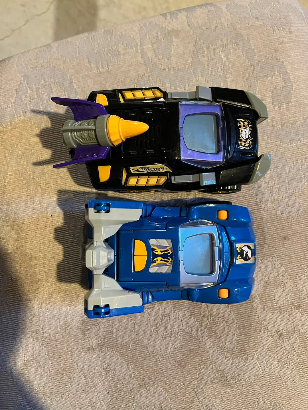 Two transforming toy cars, one blue and one black, from the Switch & Go Dinos line. These vehicles convert into dinosaur robots. Made of plastic.