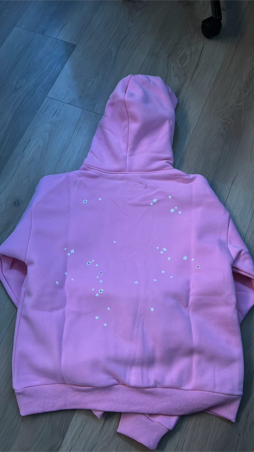 This is a pink hoodie with a spider web and "Atlanta" graphic on the front. It's 100% cotton and designed in the USA. The size is medium.