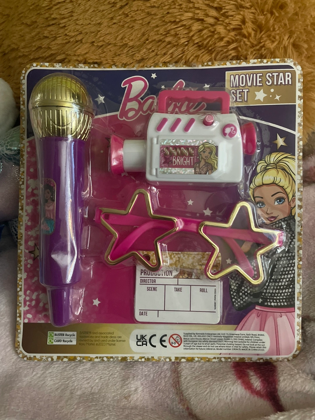 Barbie doll with a horse, saddle, and riding helmet. Also comes with vegan child friendly nailpolish and movie star accessories, along with stickers!