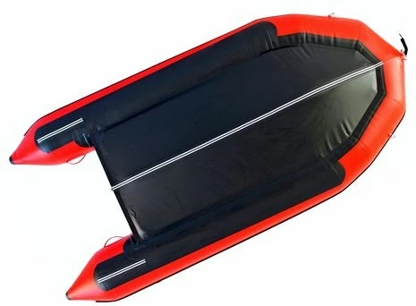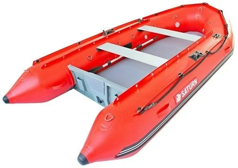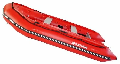 Red Saturn inflatable boat. It has built-in transom wheels for easy transport. It's made of durable material. capacity of 5 but comfortably fits 4.
