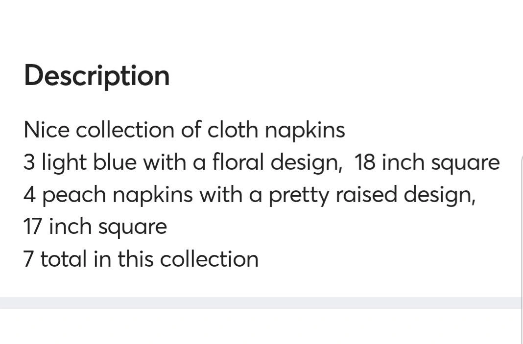 Buy & SellCollection of Cloth napkins Fabric Floral PeachCollection of Cloth napkins Fabric Floral Peach$187 cloth napkins in this collection. See the pictures for description. Pick up in Niles, Illinois.WHERE TO MEETShermer Road & Dempster StreetView MapSELLERverifiedNancyNiles1476 reviews0 chats·0 favorites·2 viewsSEND CHAT TO SELLERHi Nancy! I’m interested in your listing.Hi Nancy! I’m interested in your listing.Get the Karrot app to chatSign In to chat