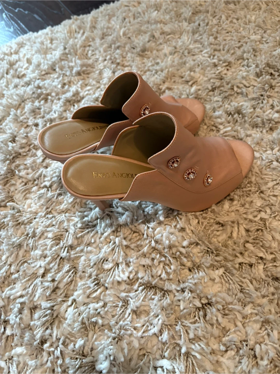 Enzo Angiolini heeled mules in a lovely pale pink satin. These shoes feature pretty embellishments on the front strap. Size is 6.