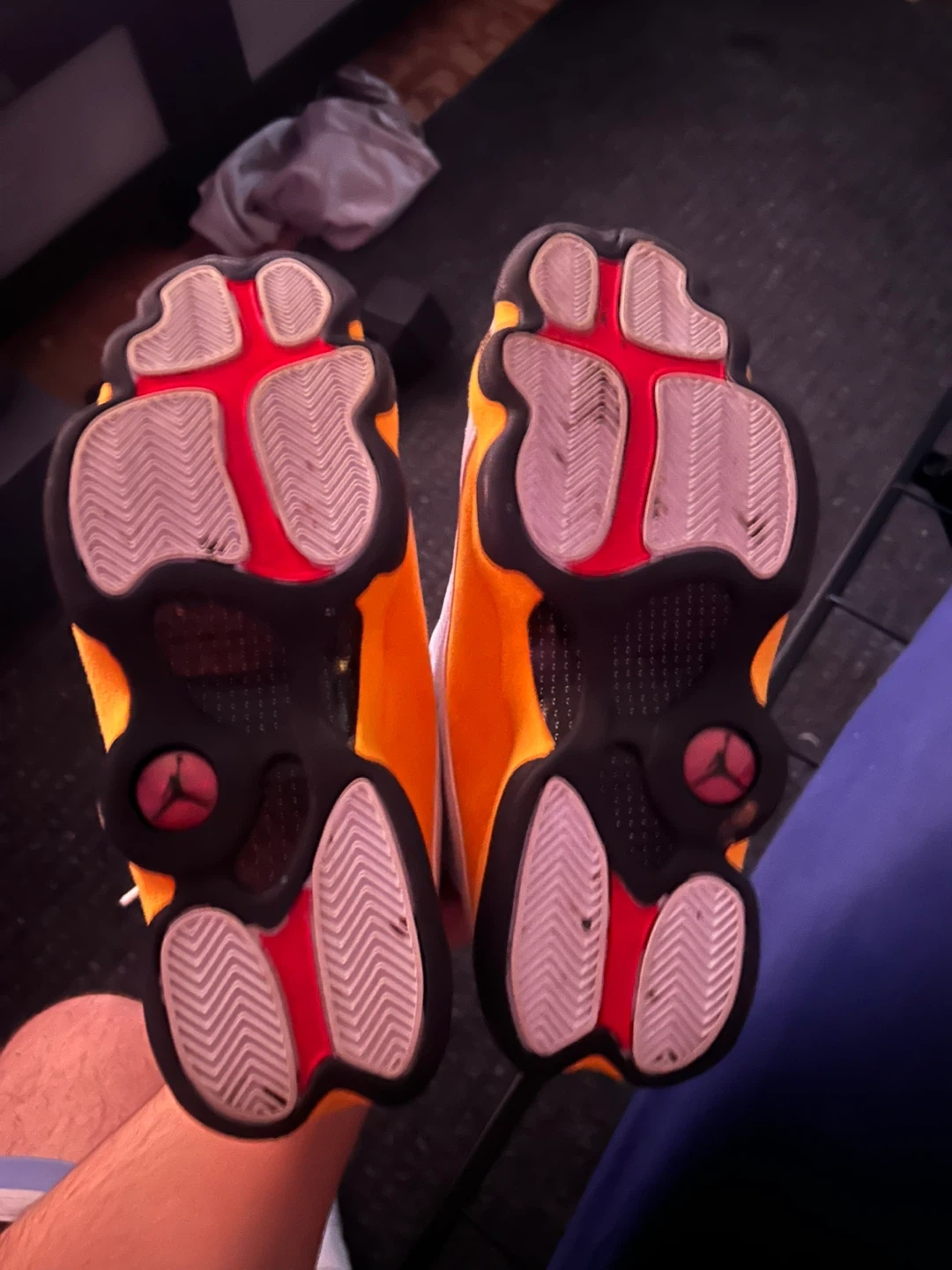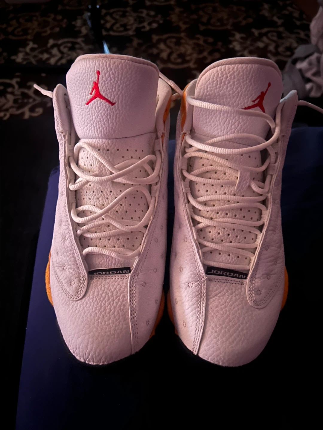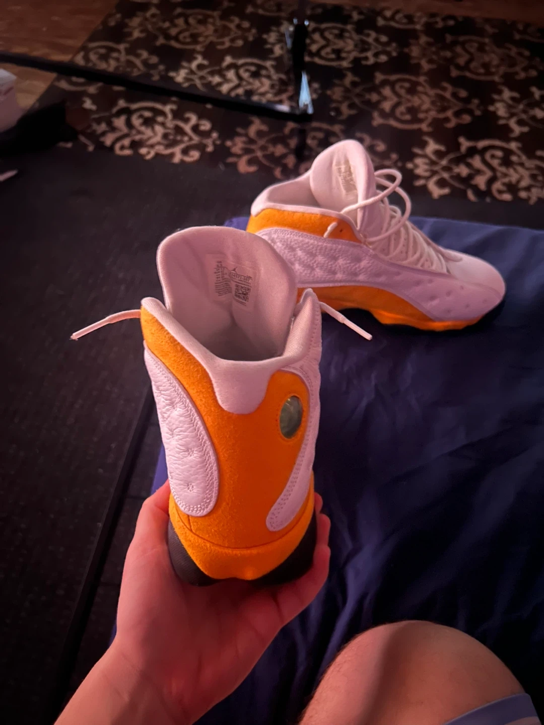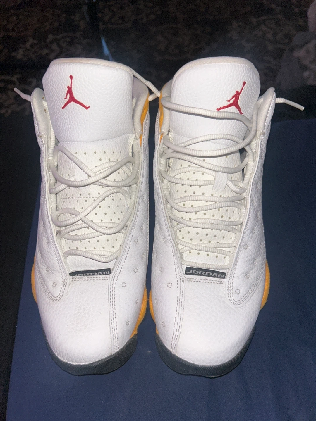 White leather Air Jordan 13 Retro sneakers with yellow accents. These athletic shoes feature a classic lace-up closure and a rubber sole.