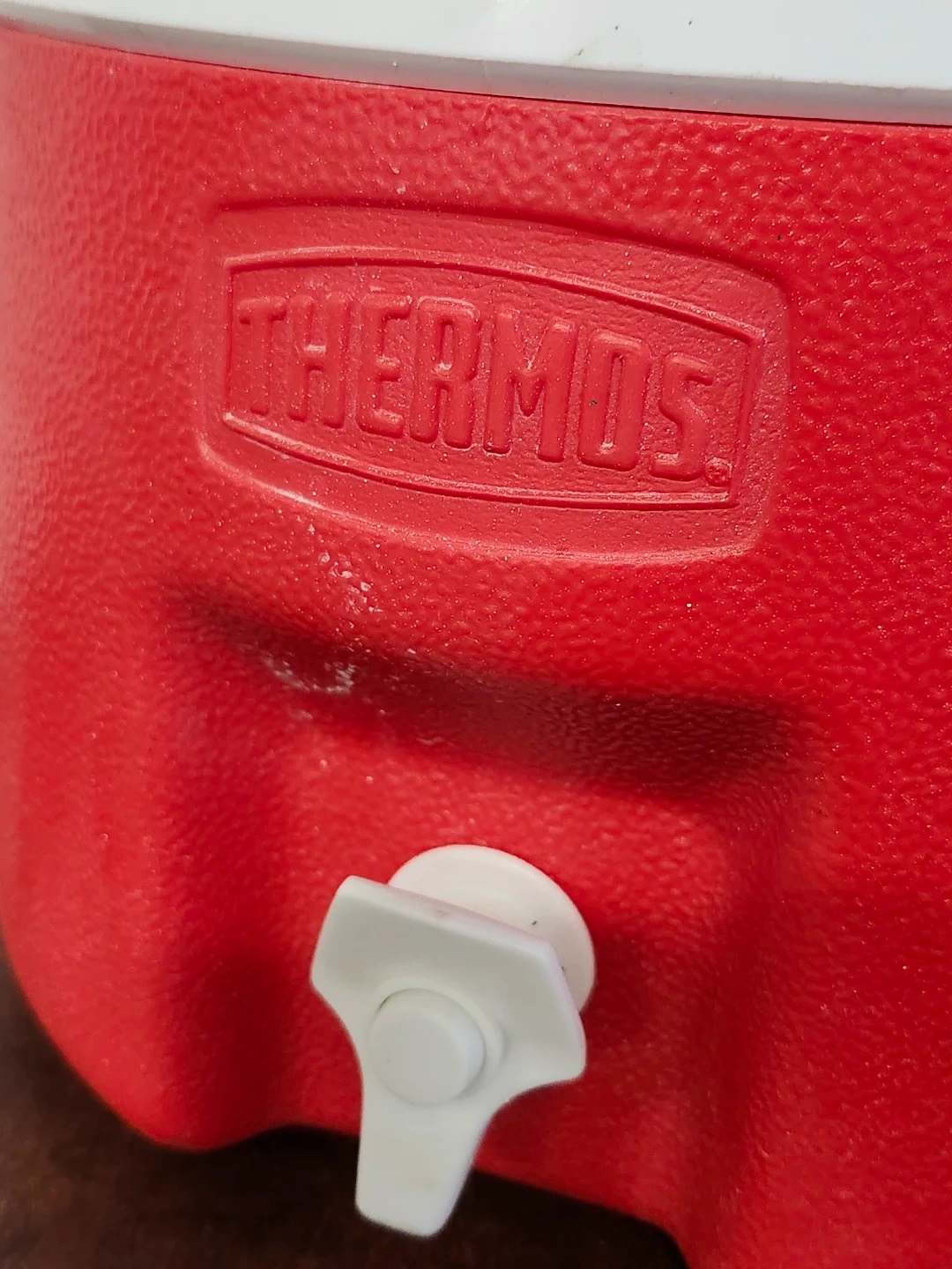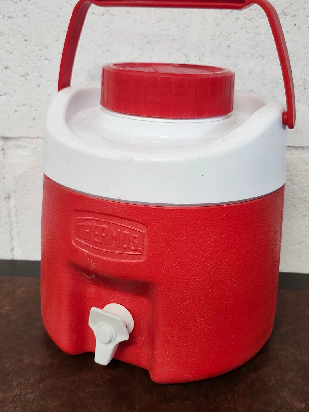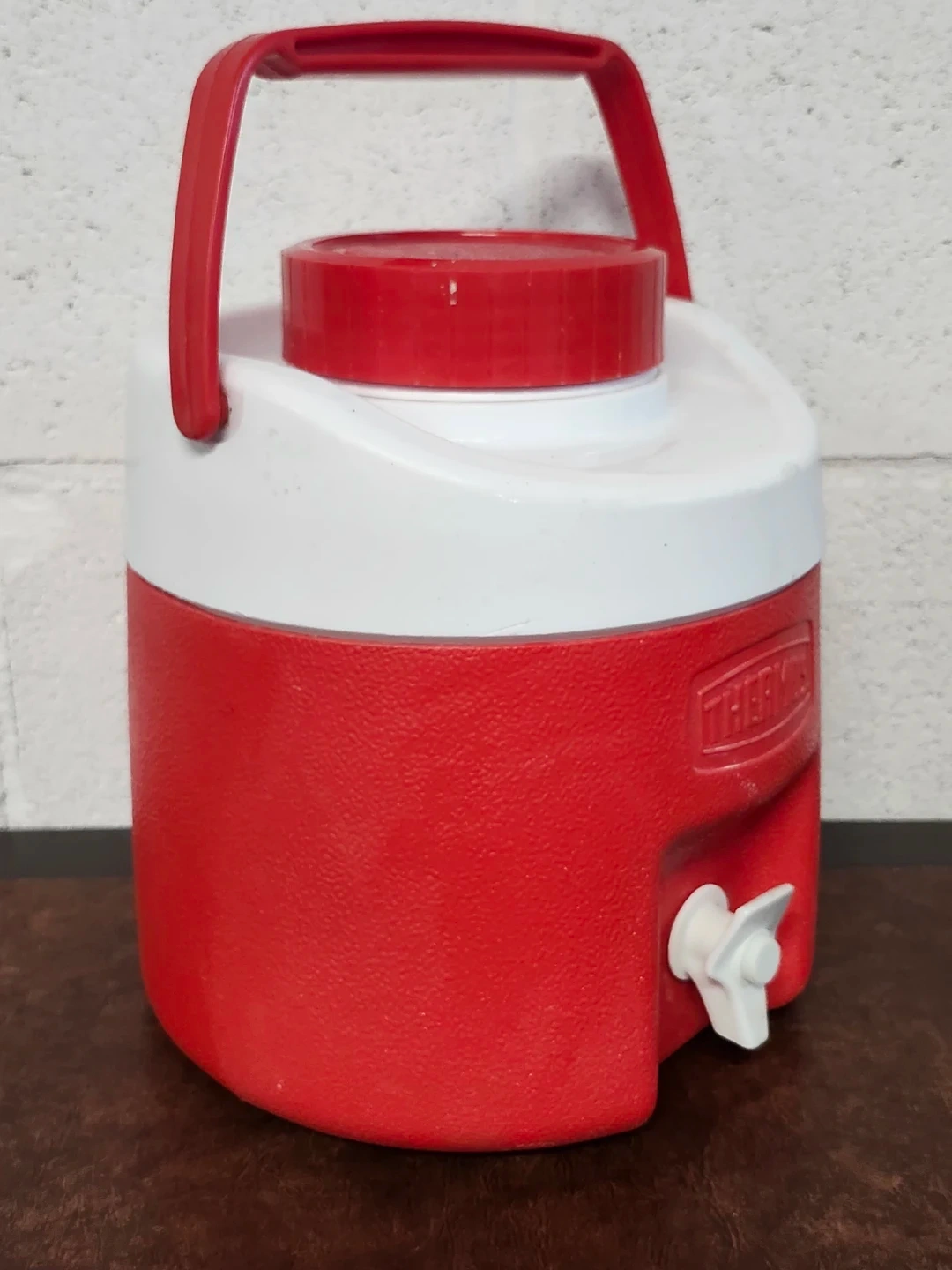 Red and white Thermos beverage cooler jug with a white spigot. This jug is perfect for keeping drinks cold at gatherings or outdoor events. It has a durable plastic construction with a sturdy handle for easy transport.