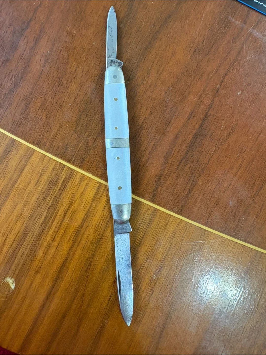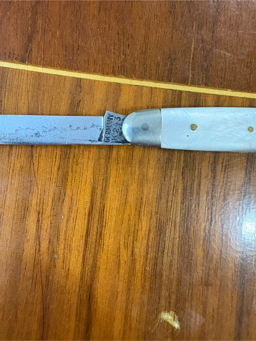 A classic folding pocket knife with two blades. The handle is mother of pearl. It's stamped 'Germany' K243. This knife is a great utility tool for everyday carry or collecting.