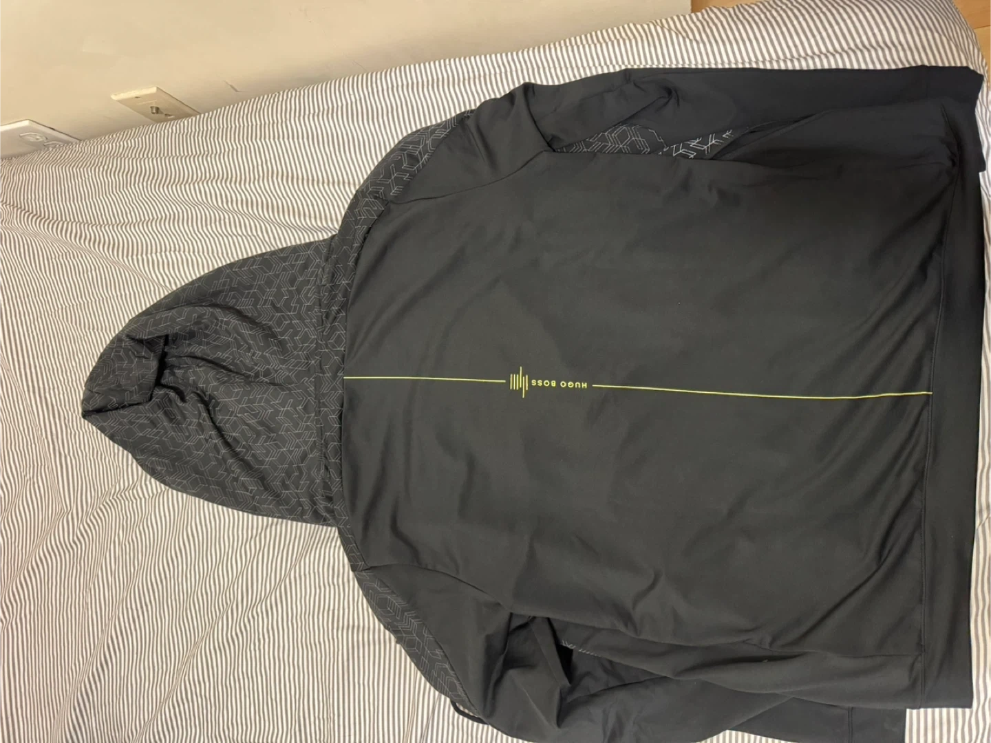 Hugo Boss black hoodie in size medium. It's in great condition and ready for a new owner! The hoodie features a unique geometric pattern on the hood and upper chest, adding a touch of style. Perfect for layering or wearing on its own. Free delivery within Markham and Scarborough.