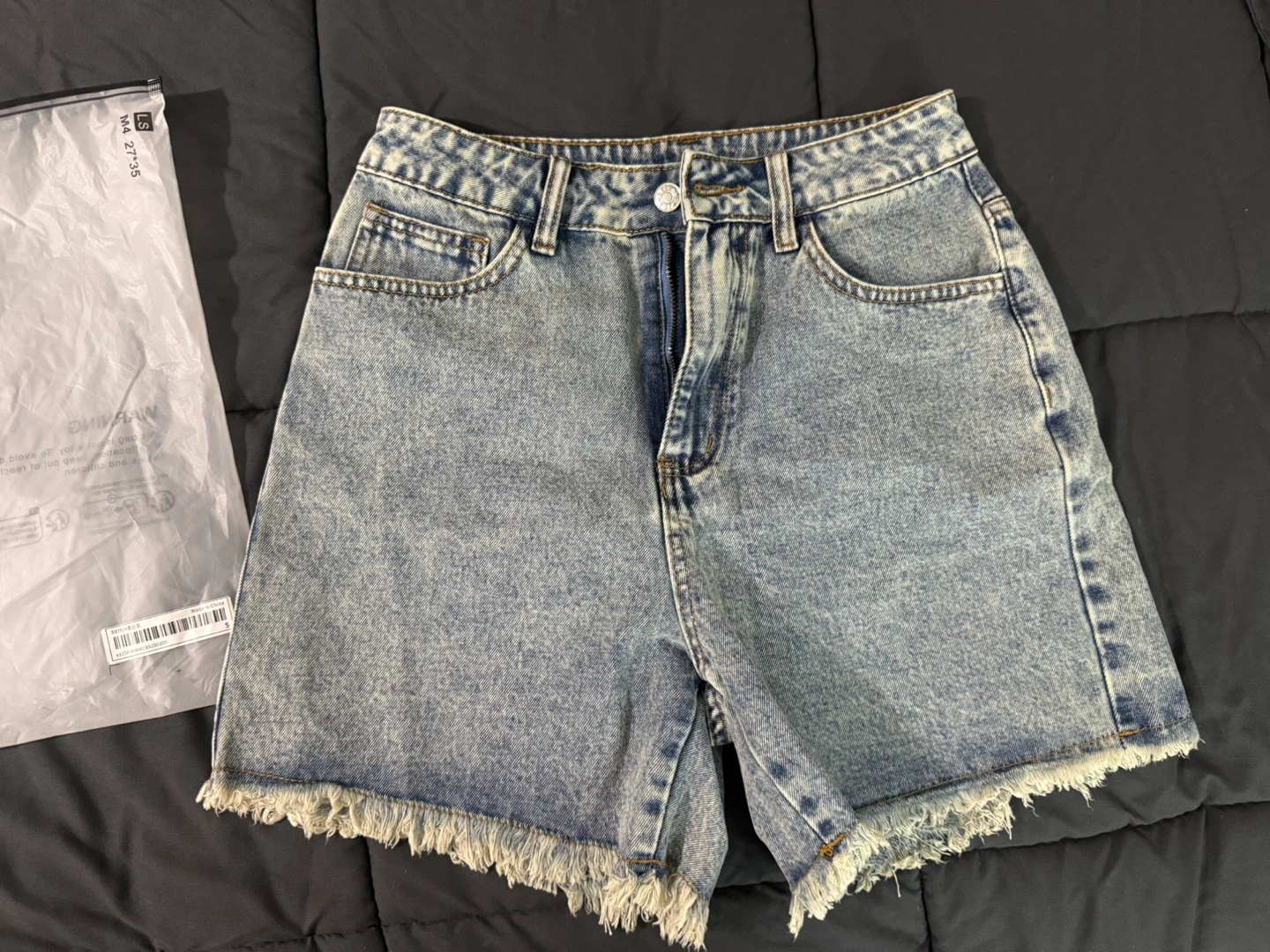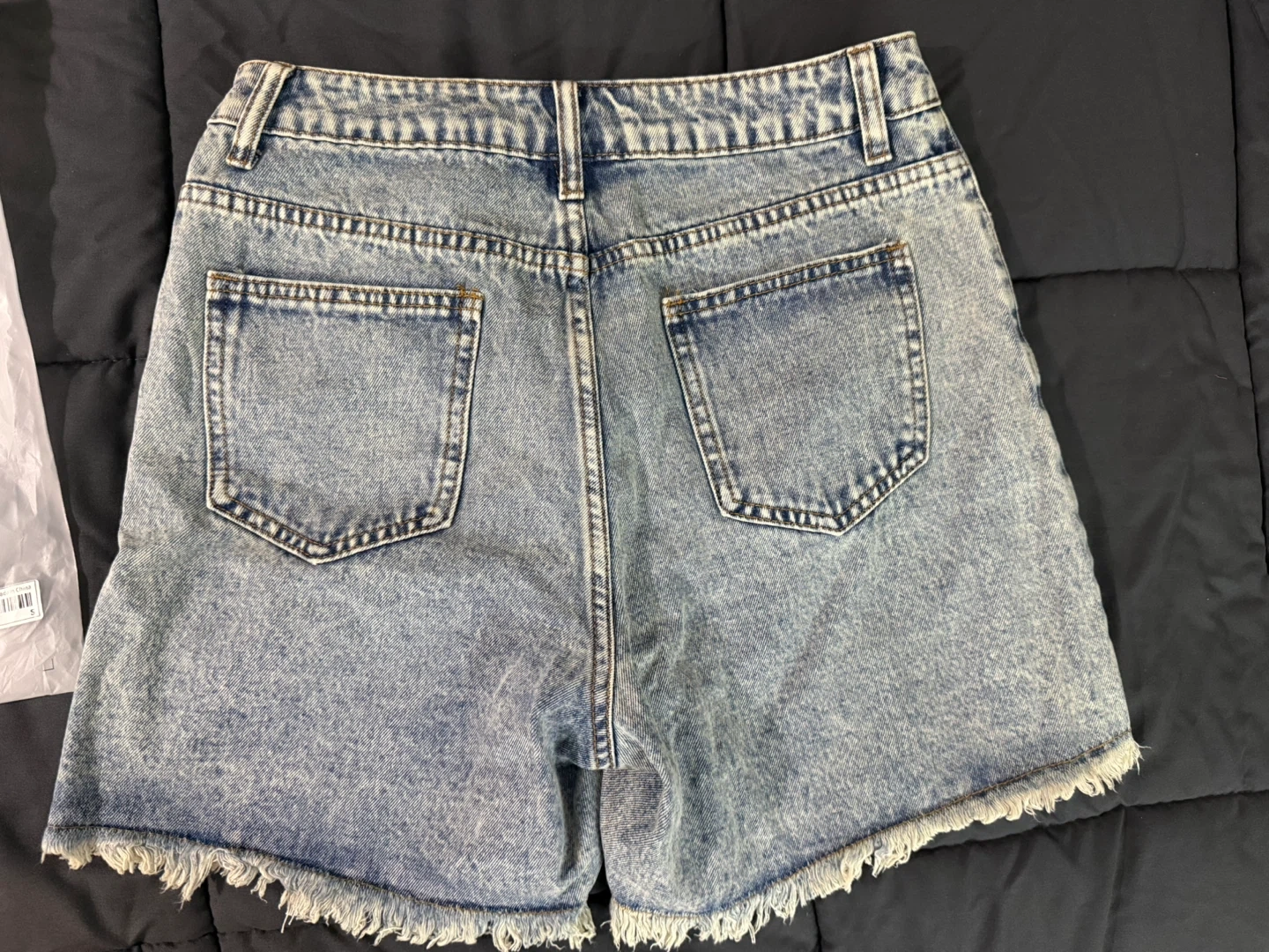 These acid wash denim shorts feature a frayed hem for a stylish look. They're made with denim material. This would be a great addition for warmer weather outfits!