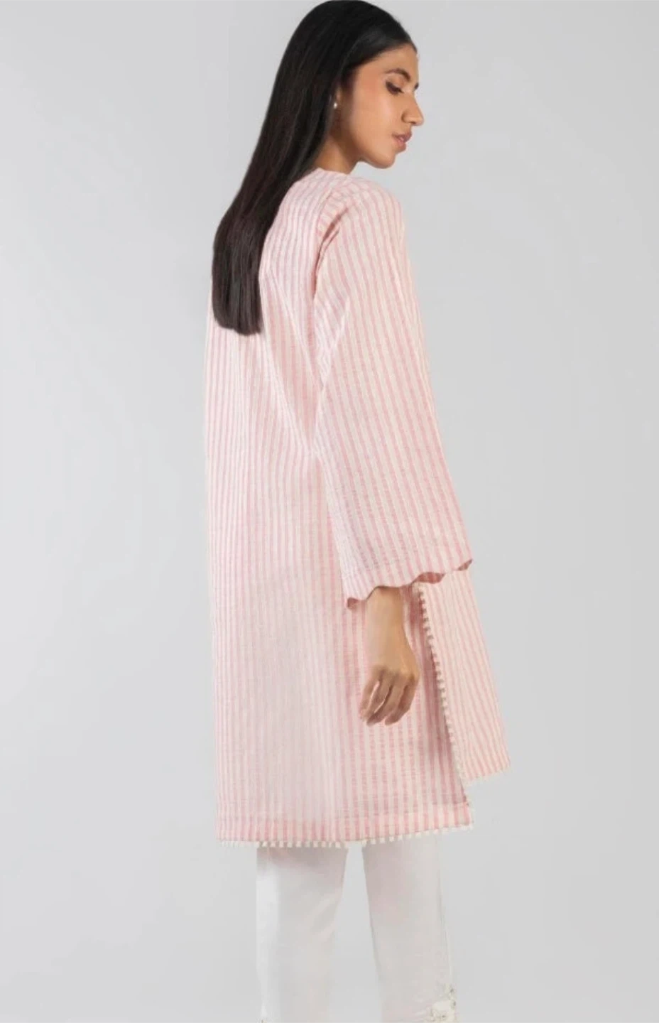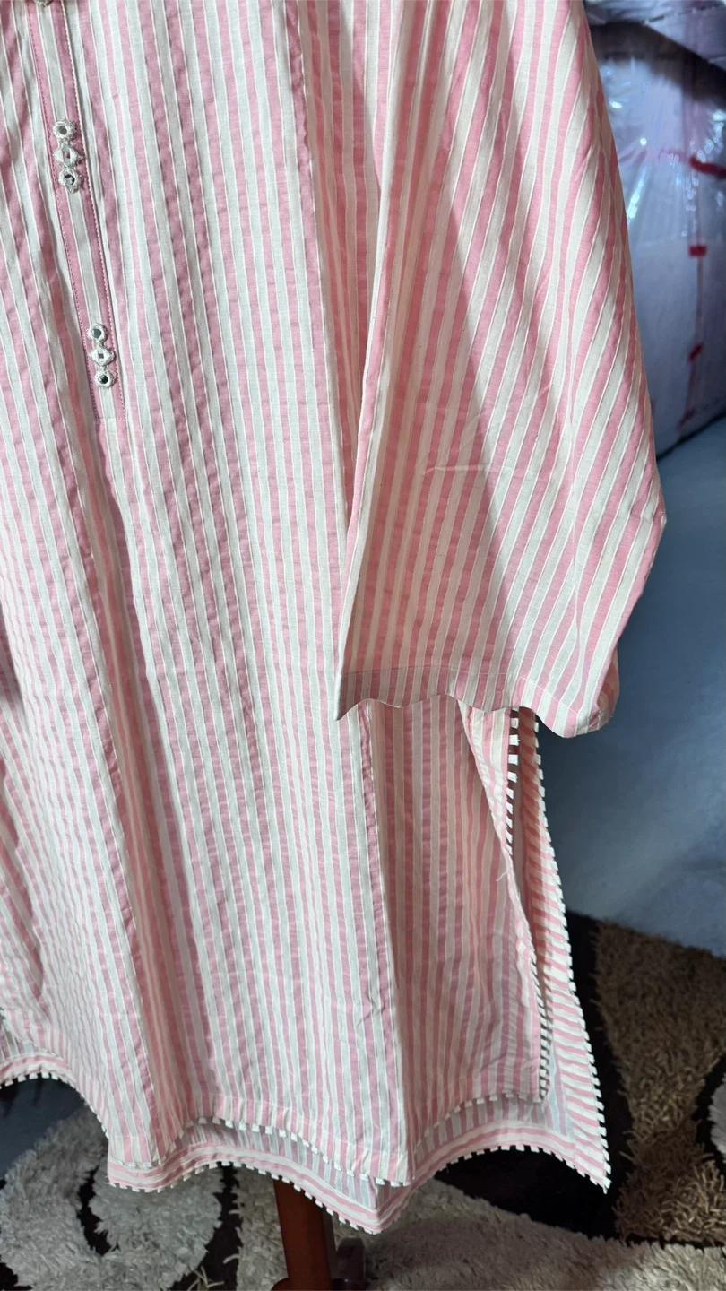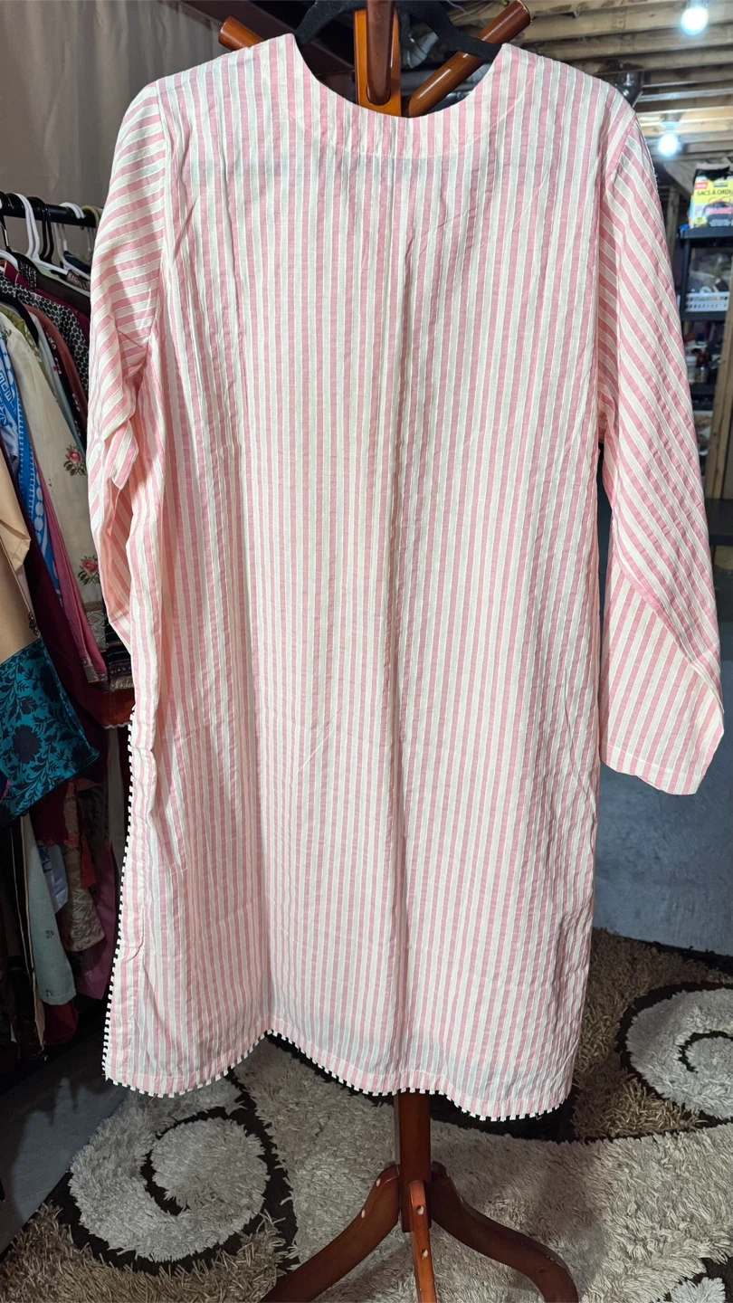 Selling a lovely kurti in a pink and white striped pattern. It's a size 42L and features a unique flared sleeve design. Perfect for adding a touch of elegance to your wardrobe!