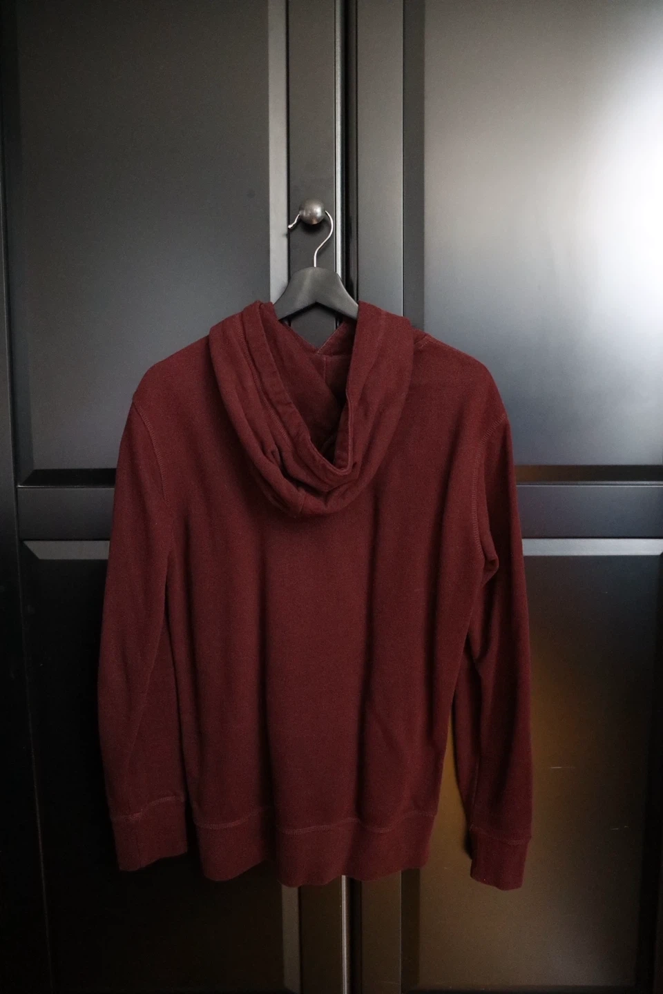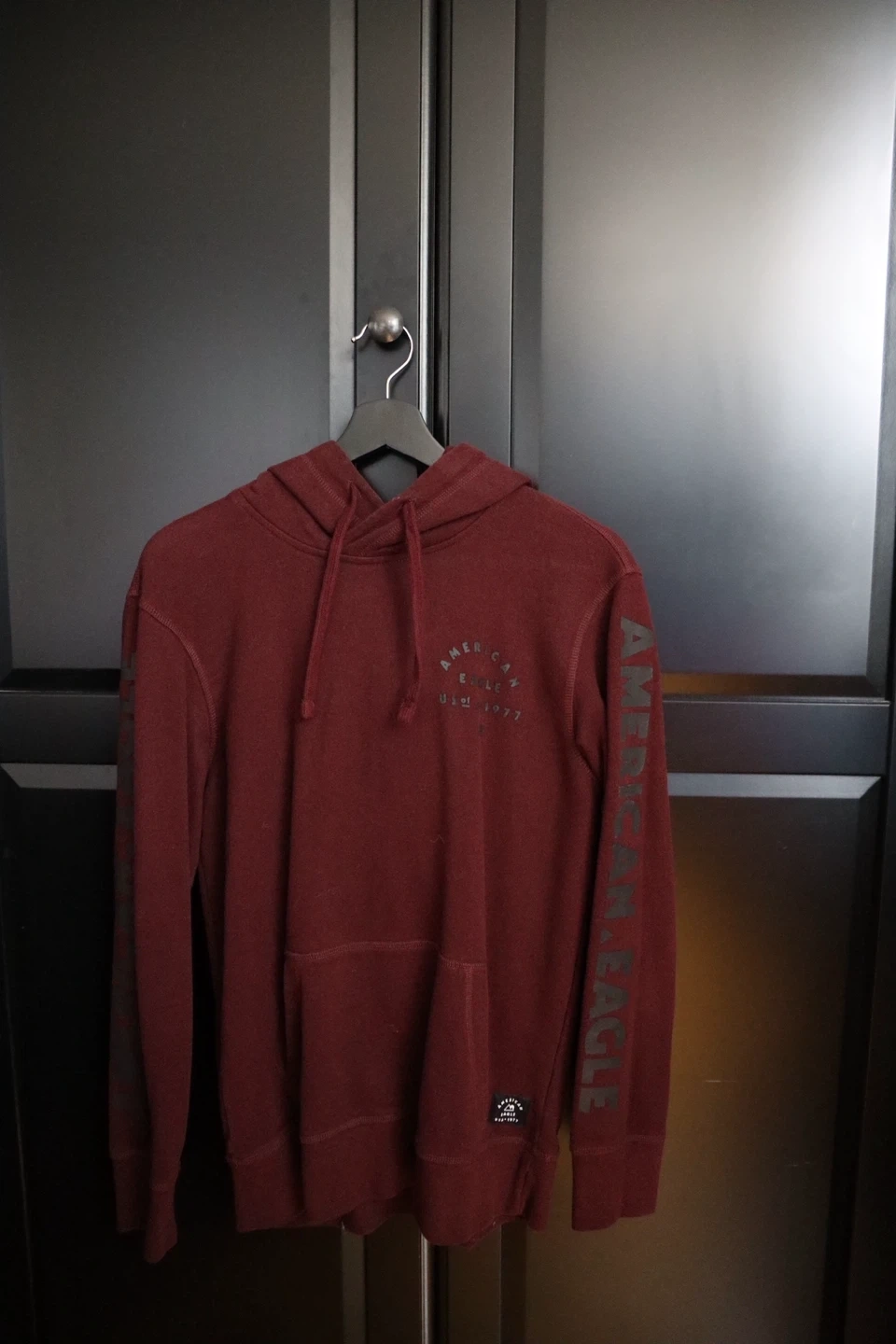 Maroon/Burgundy American Eagle hoodie with graphic details on the chest and sleeve. It's a comfortable pullover with a front pouch pocket. It’s too small for me and never used. Extra Small