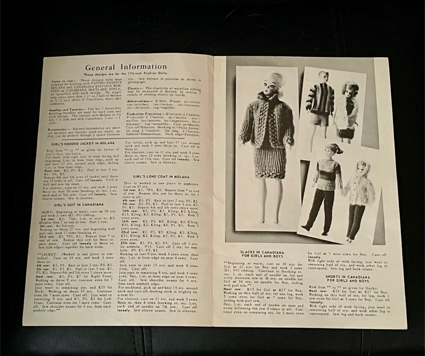 This vintage knitting pattern pamphlet by Beehive features handknits for Barbie and Ken type dolls. It includes patterns for outfits in Molana and Canadiana styles. Four pages as shown. Pages are clean except for small piece of blue tape on front cover bottom.