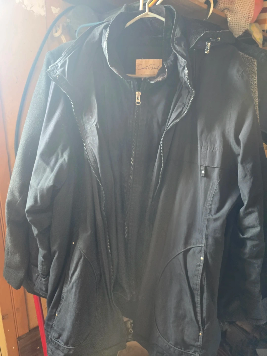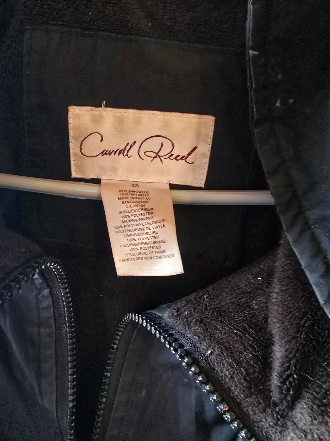 This is a black jacket from Carol Reed. It's a size 3X. The shell is 100% polyester with a lining of 100% polyester. It's great for layering in cooler weather!